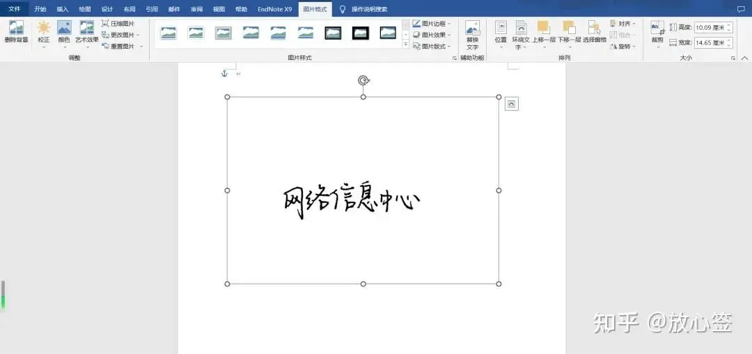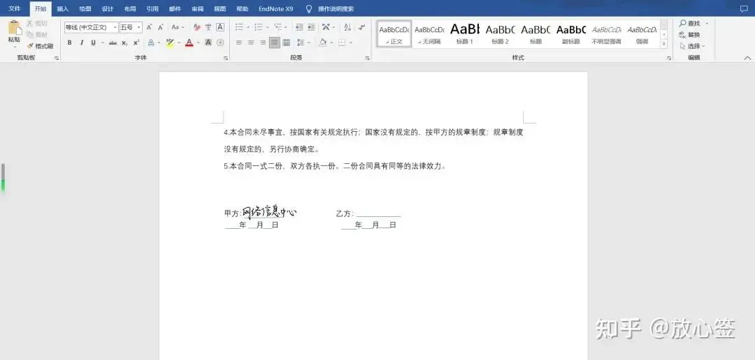 首先我们打开需要添加手写签名的文档,然后在空白处输入“手写签名”(也就是我们之前设置的快捷短语),Word就能够立刻生成我们保存好的签名,将签名图片拖至签名处,并调整至合适大小即可。