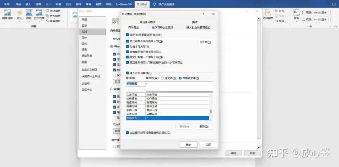 首先单击图片,选择签名,进入「文件」-「选项」-「校对」,再点击「自动更正选项」,在「替换」中输入一个快捷短语,这样方便我们下次直接使用,而不需要重新设置签名格式。