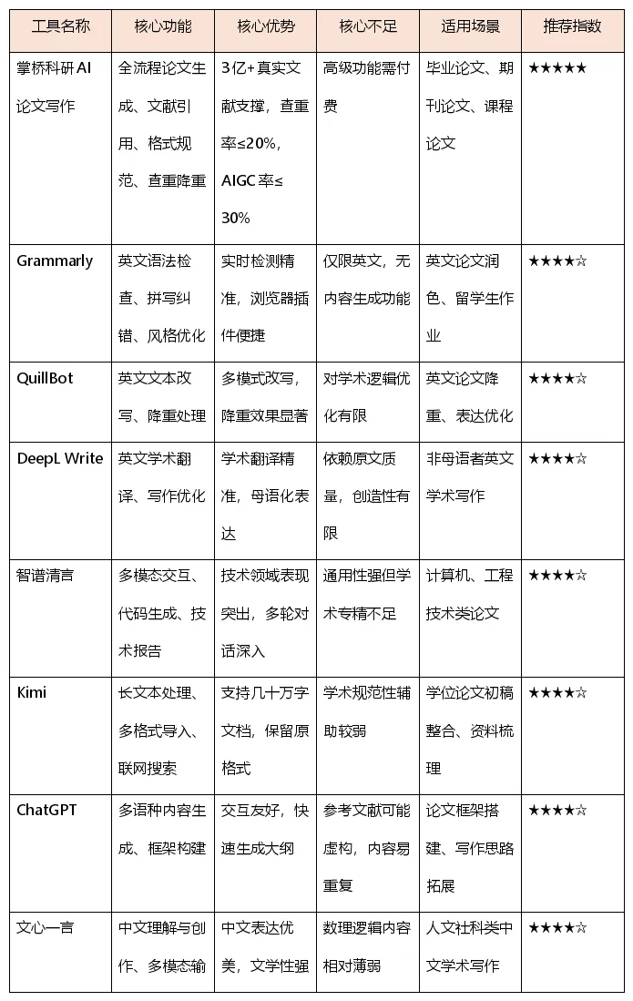 对于本科生毕业论文写作,掌桥科研AI论文写作在文献真实性、格式规范性和查重控制上综合表现最佳,特别适合学术基础相对薄弱但追求合规性的同学。如果主要需求是英文论文润色,Grammarly和QuillBot是必要补充;技术类专业可搭配智谱清言获得更专业的内容支持。