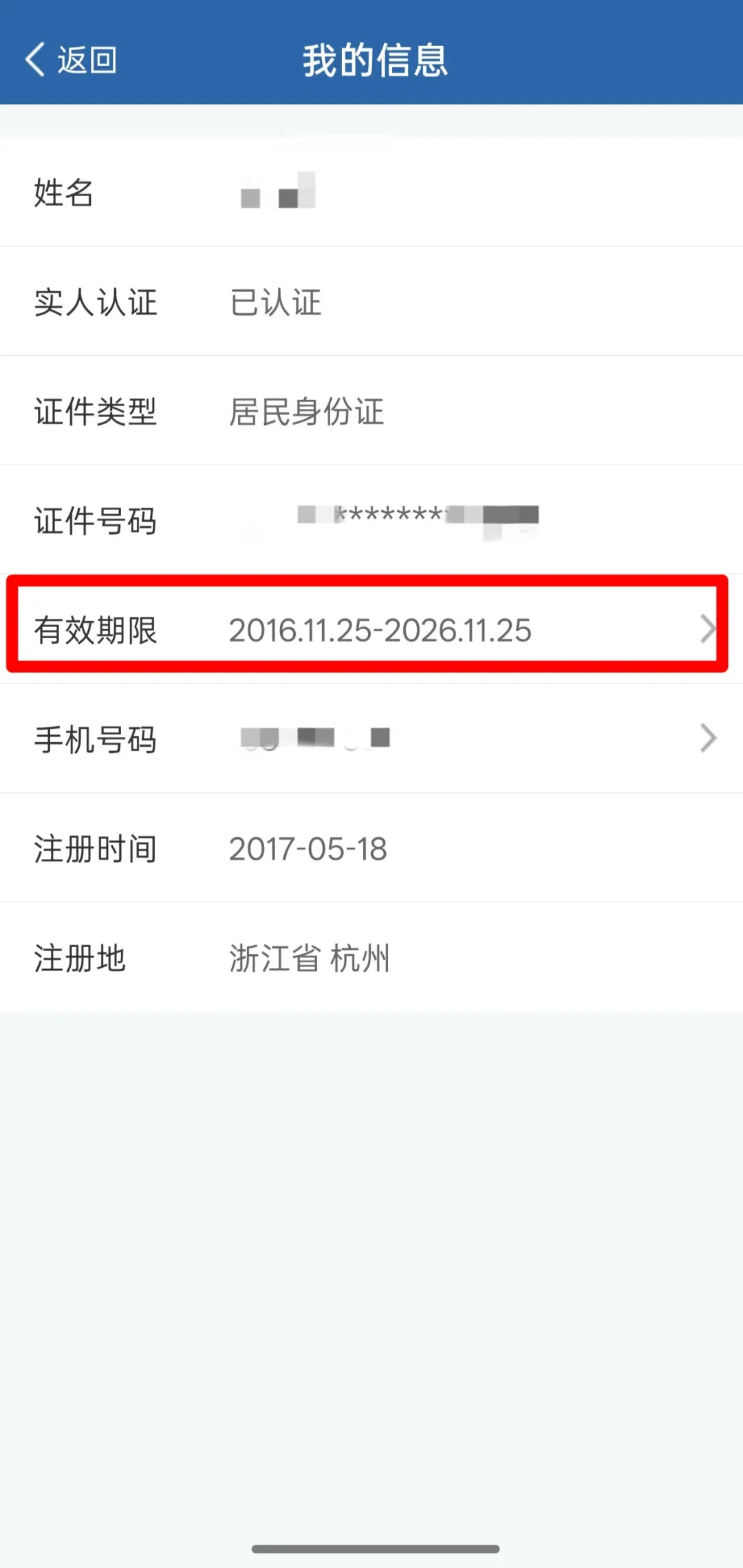 第2步:点击“我的信息”,进入身份证有效期限。