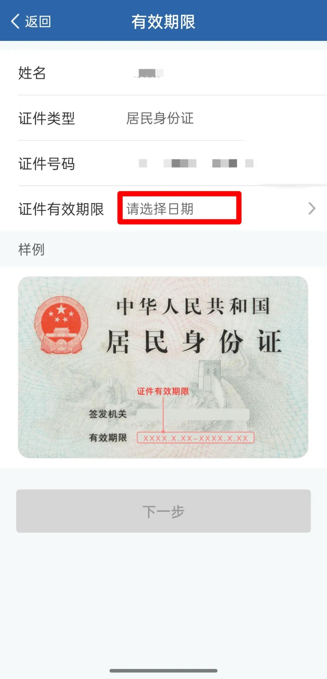 第3步:填写新的居民身份证的有效期始,选择有效期,点击下一步。