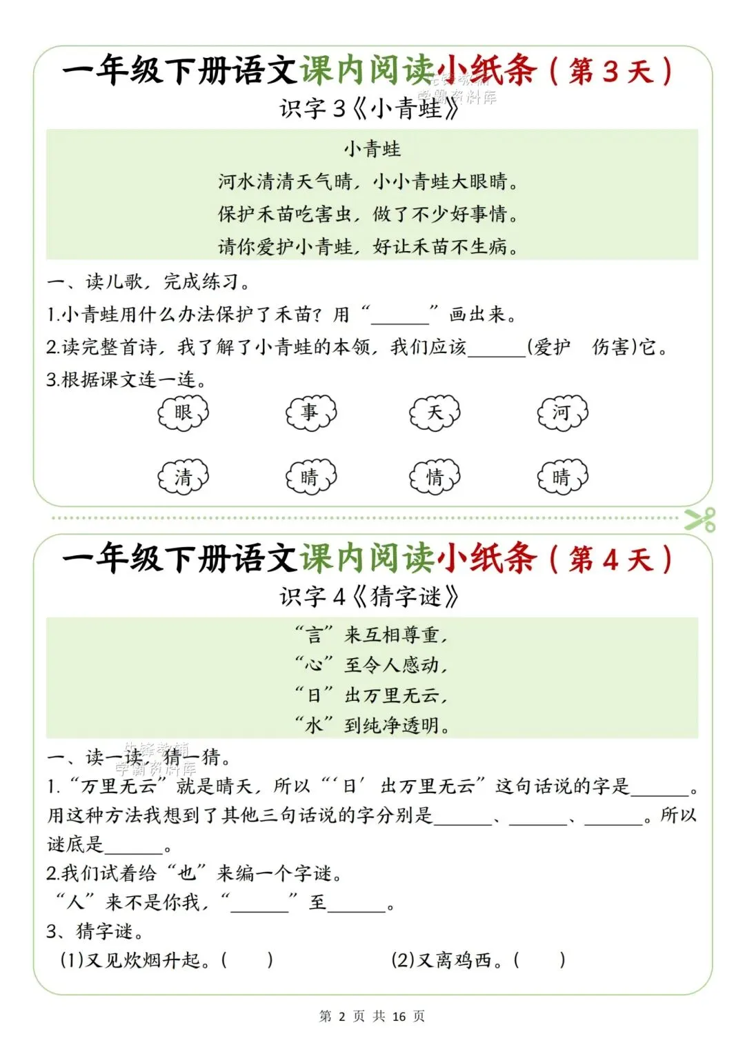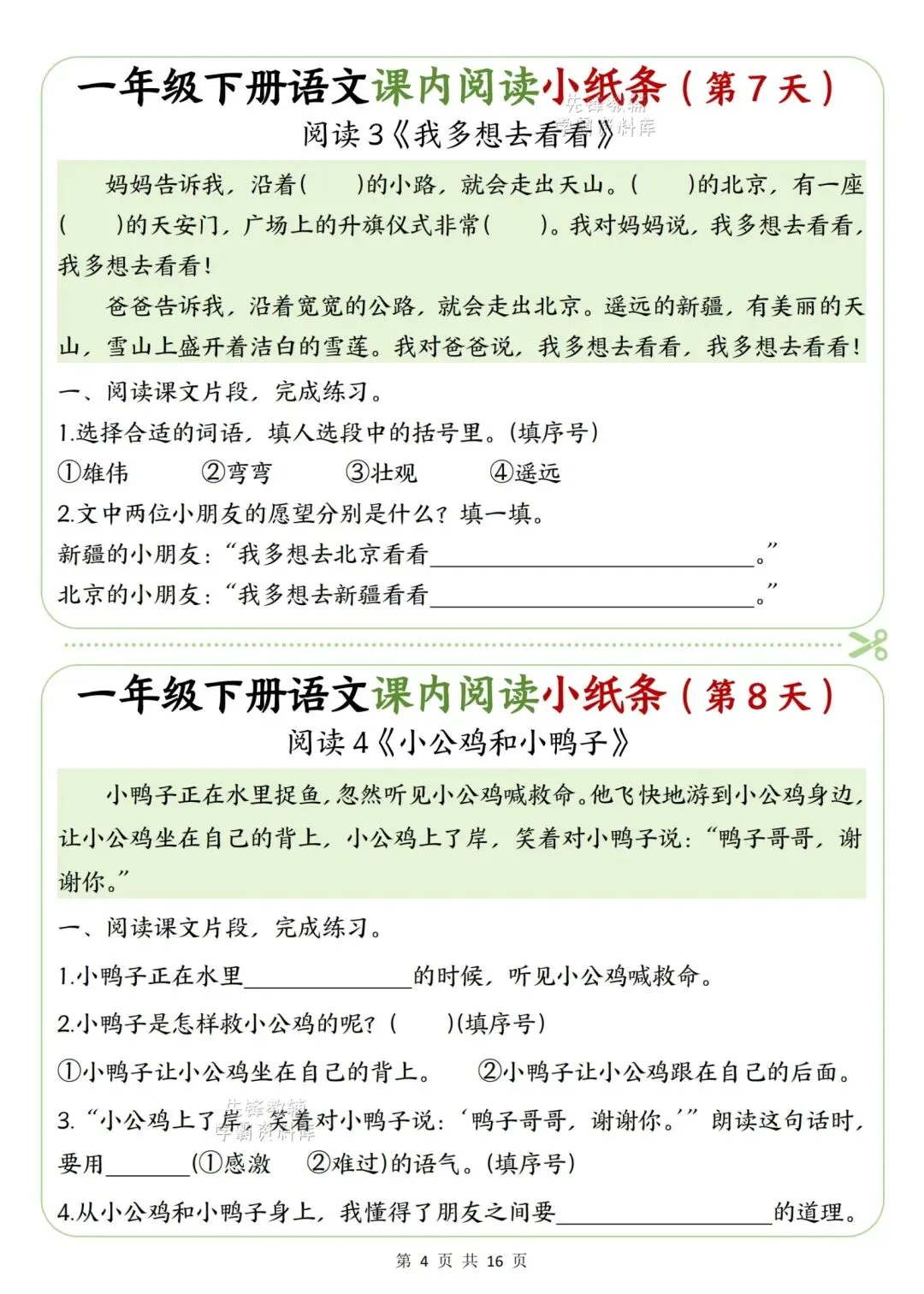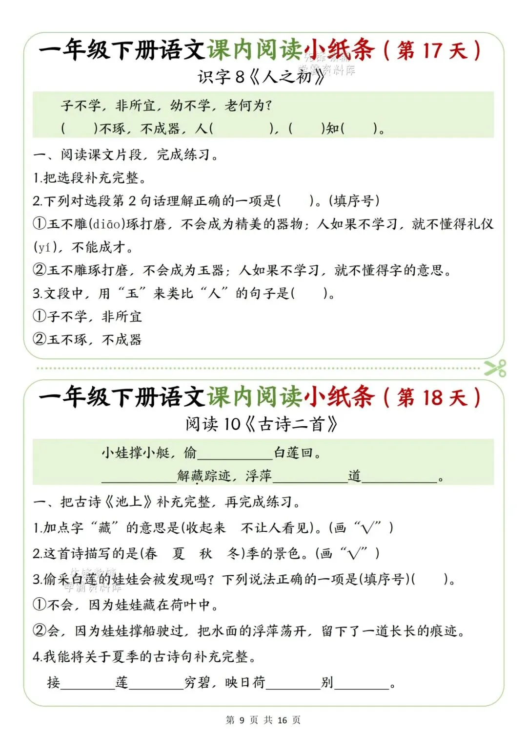 新版一年级下册语文课内阅读小纸条高清电子版可打印