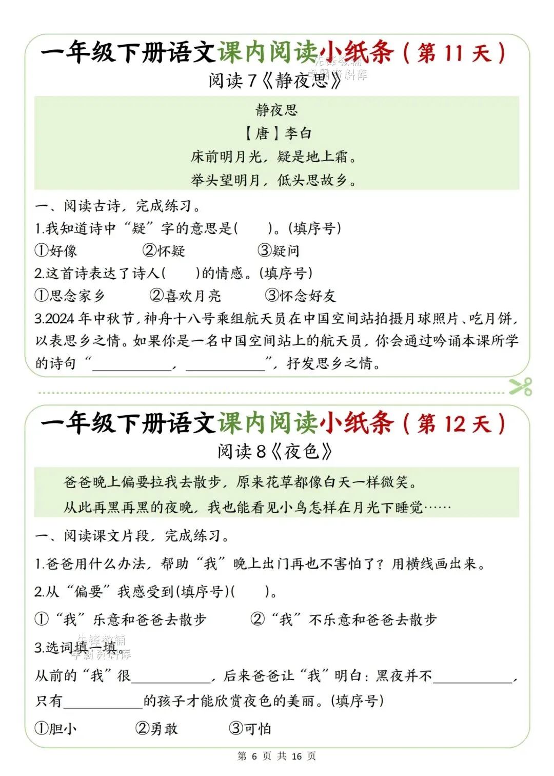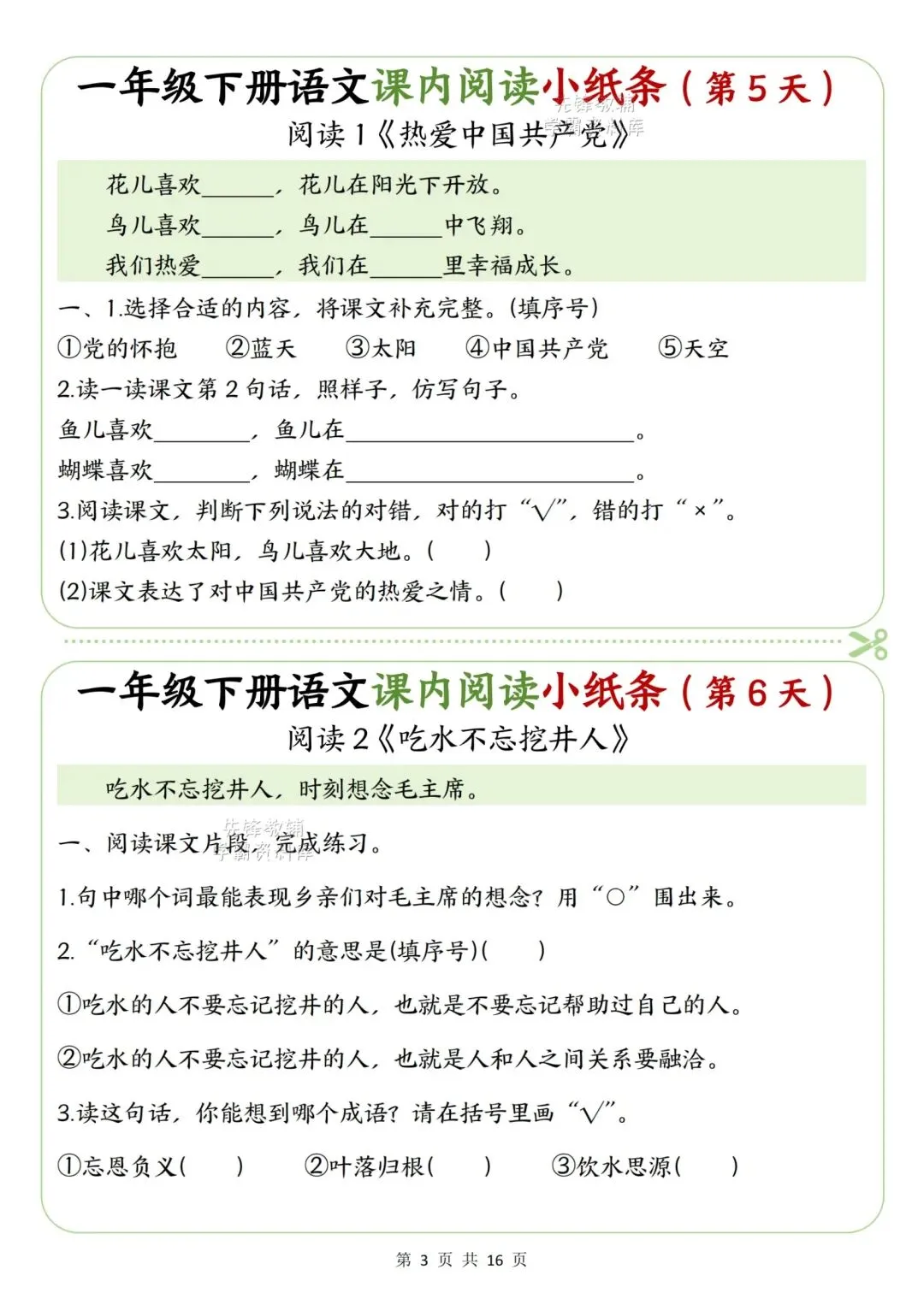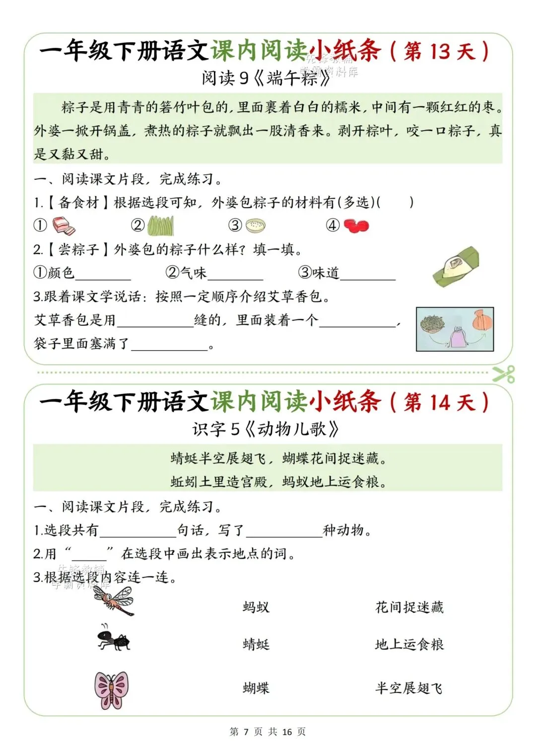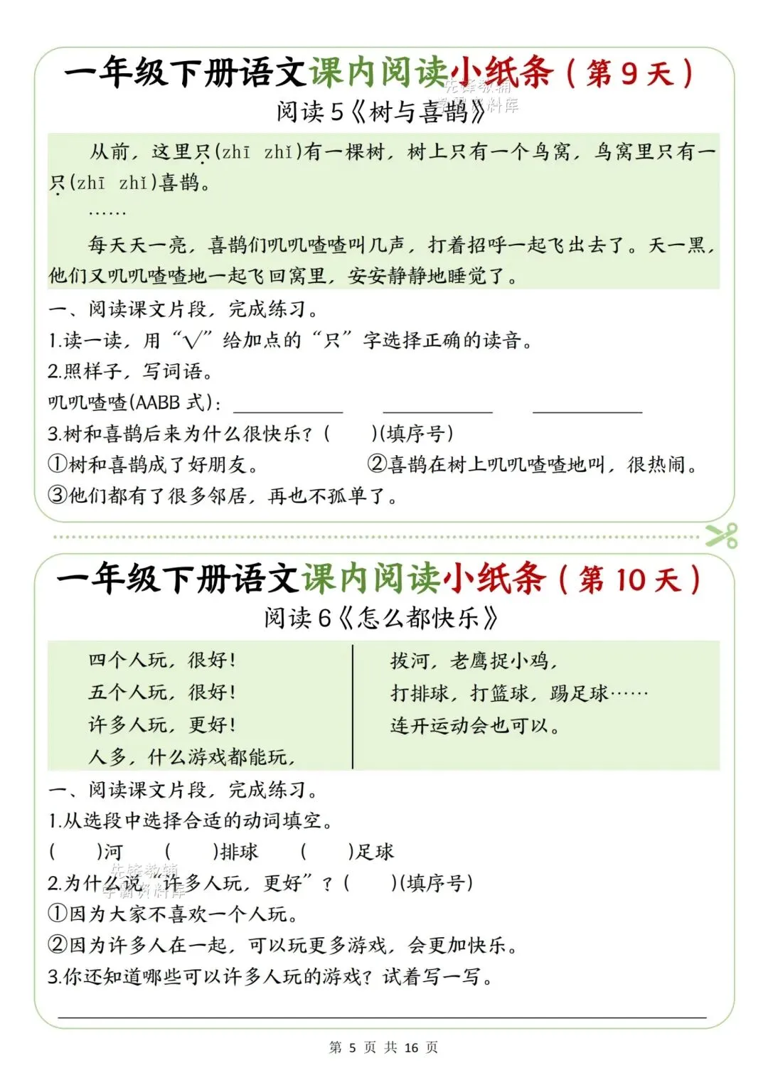 新版一年级下册语文课内阅读小纸条高清电子版可打印