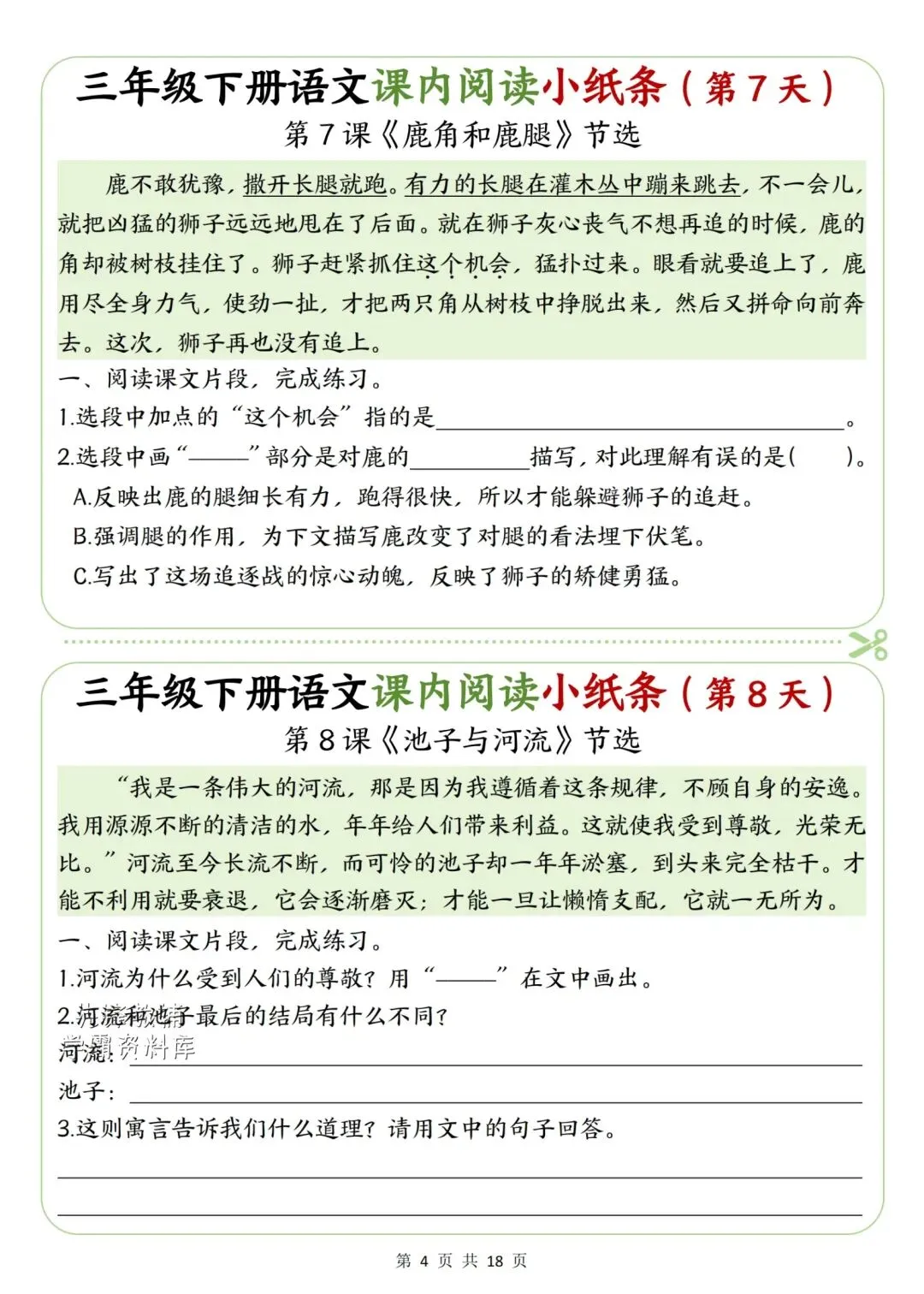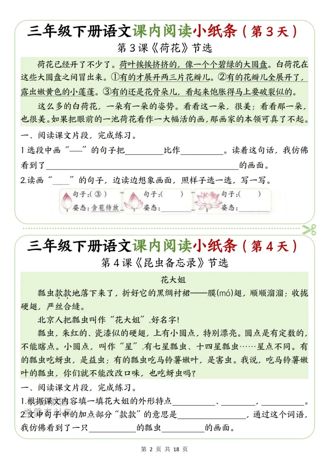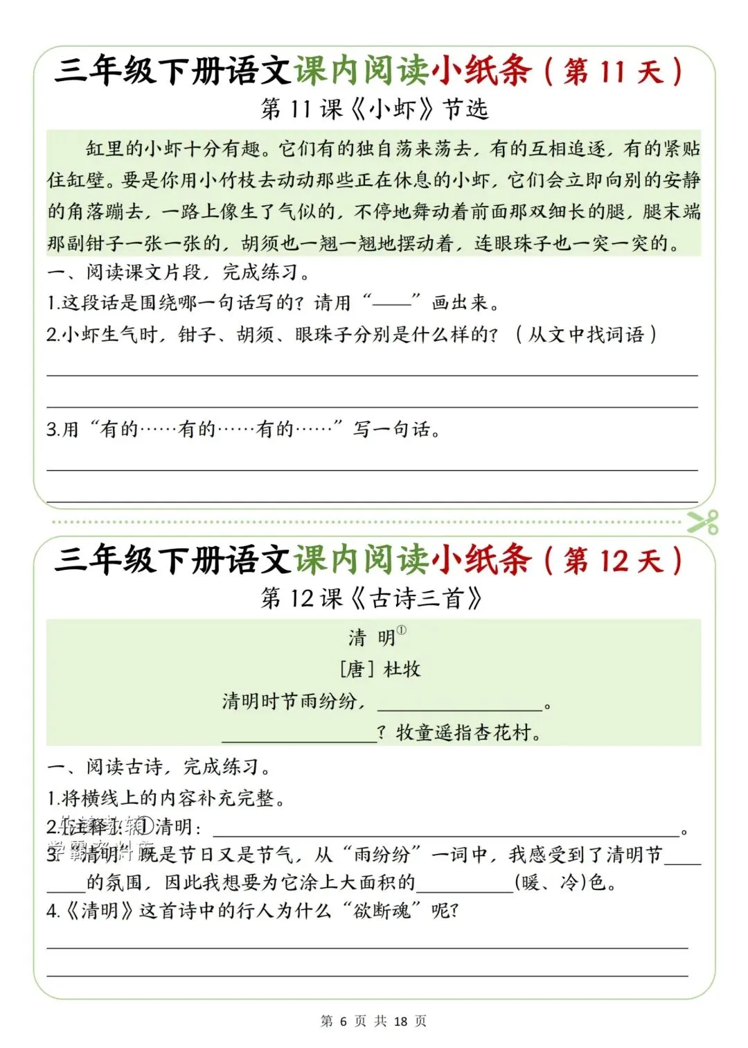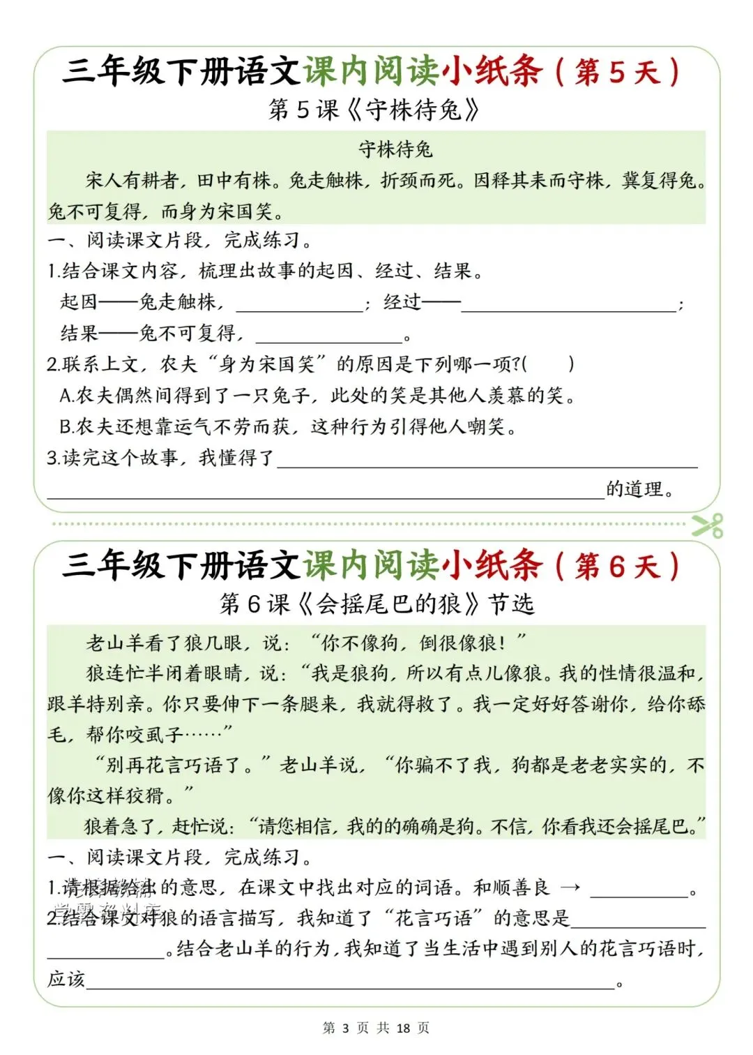新版三年级下册语文课内阅读小纸条高清电子版可打印