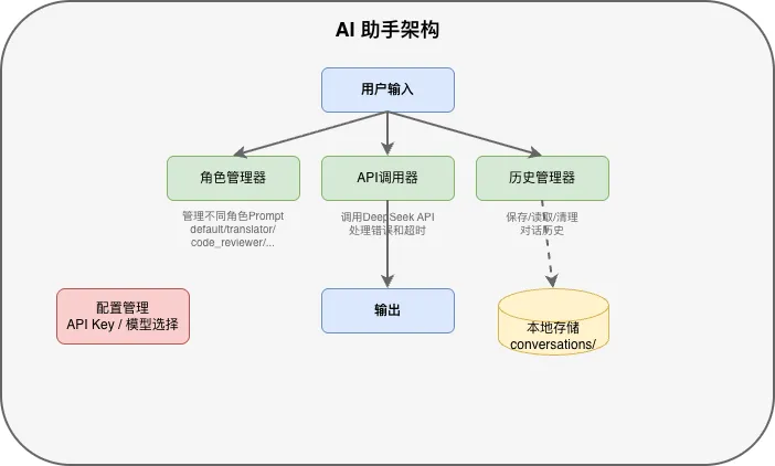 ai-assistant/├── main.py # 主程序入口├── config.py # 配置管理├── roles.py # 角色定义├── history.py # 历史管理├── api_client.py # API调用├── requirements.txt # 依赖列表└── conversations/ # 对话历史存储└── .gitkeep