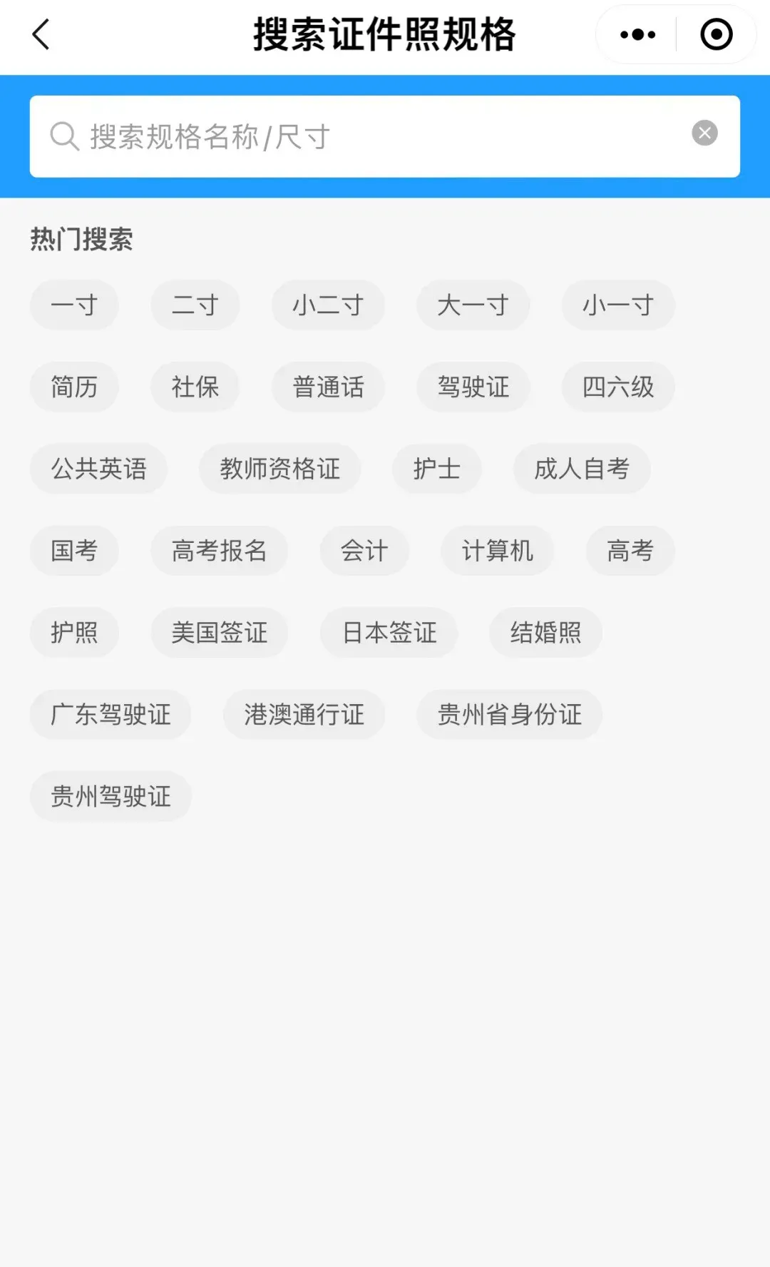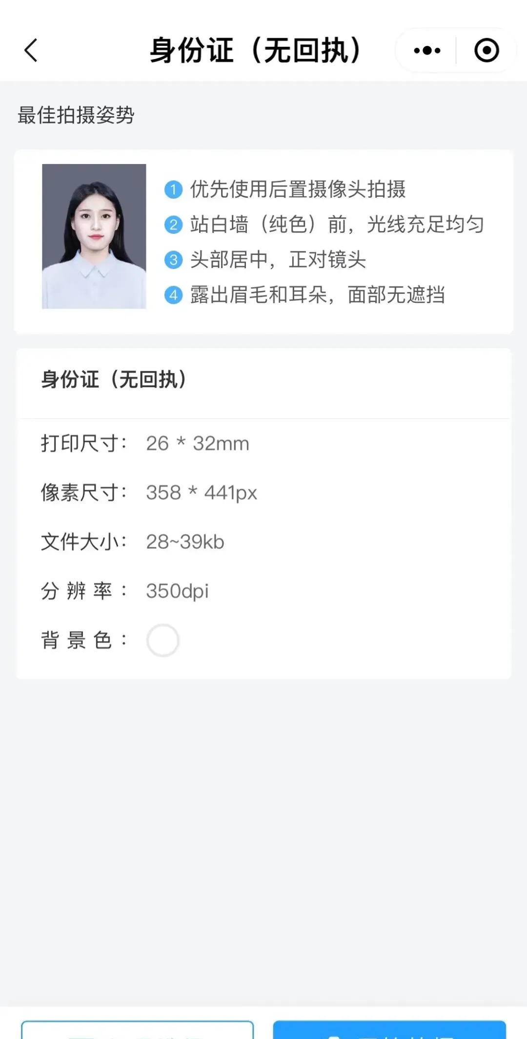 热门证件照,点击页面下方热门证件照,里面除了有常用寸照以外,还有身份证、驾驶证、社保证、简历、普通话水平测试、英语四六级、教师资格证选项等。找到相应的尺寸或类别以后,点击进入,跳转到拍摄页面。(如下图)