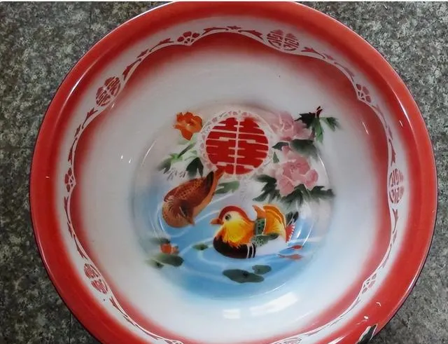这脸盆大部分60后都见过,红边白底,中间印着两只鸳鸯戏水,还有一团红色的囍字,瓷面有点发亮,拎在手里凉飕飕的,小时候洗脸、洗水果全靠它,跌地上哐啷就是一声脆响,妈妈总说摔坏了可不便宜,那会搪瓷盆算稀罕物,结婚还要置办新盆送人,现在买个塑料脸盆一抓一大堆,这种带花的搪瓷盆反倒成了怀旧收藏品。