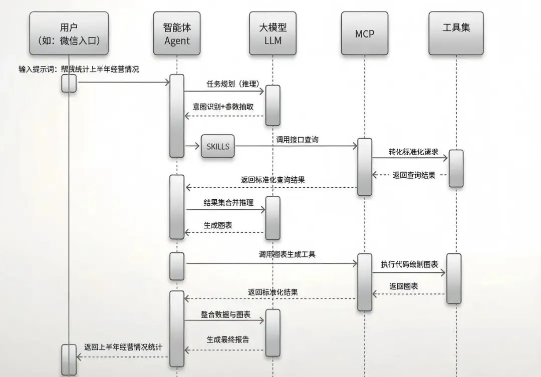 其核心逻辑是:Agent智能体接收用户提问后,先将问题传递给大模型LLM进行语义解析与意图识别,结合预设的SKILLS(技能集),再通过MCP中间件调用对应的工具集(如数据查询工具、统计分析工具),对实时业务数据进行加工、整理、分析,最终返回精准的查询结果。这一过程,相当于为AI赋予了“主动思考、主动调用工具”的能力,让AI从“问答工具”升级为“决策助手”。