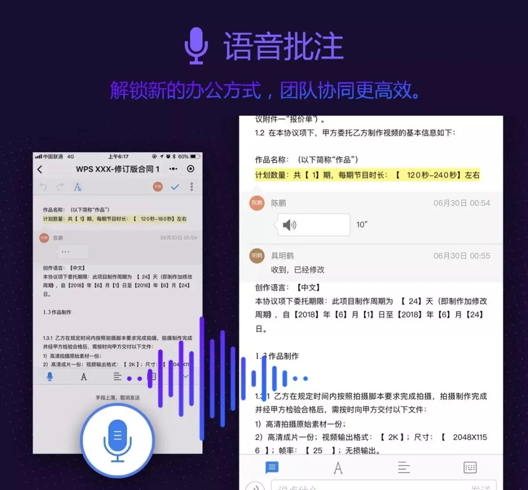 移动办公、多人在线协作已然迫在眉睫。这一次发布的WPS文档,以云技术为支撑,在兼容超大文件、全功能格式的基础上,WPS文档操作入口多元化,可实现多人实时讨论、共同编辑、随时分享的创作体验。另外,为了配合移动办公的场景,WPS文档还拥有语音批注功能,让你在不方便打字的时候也能完成工作。