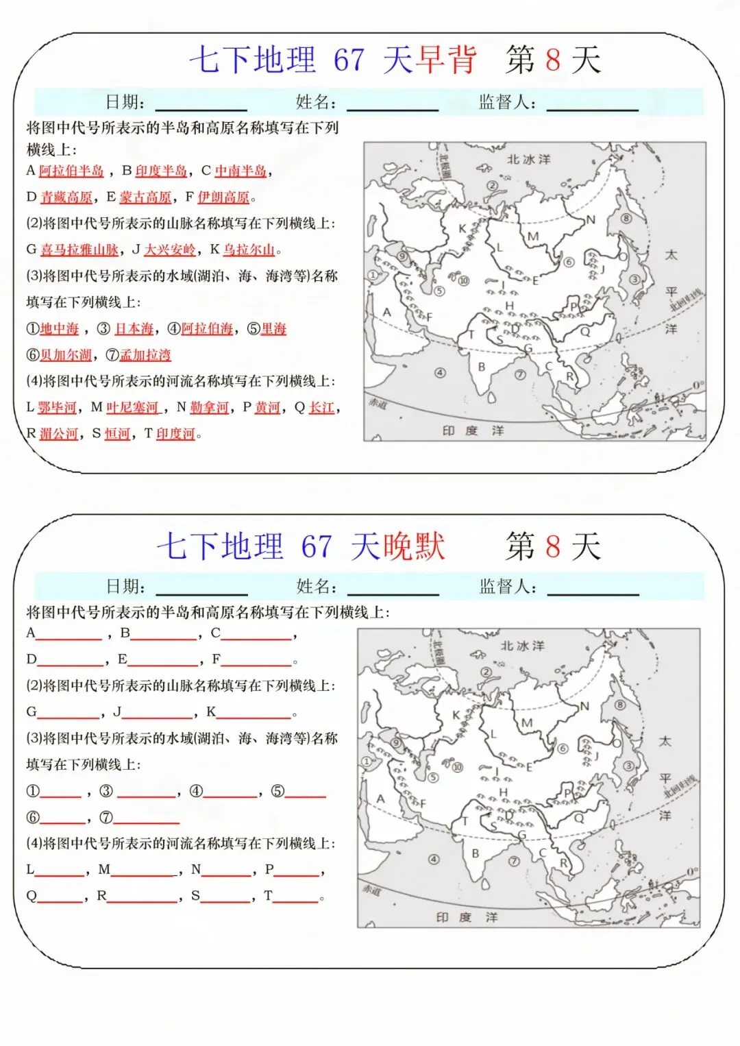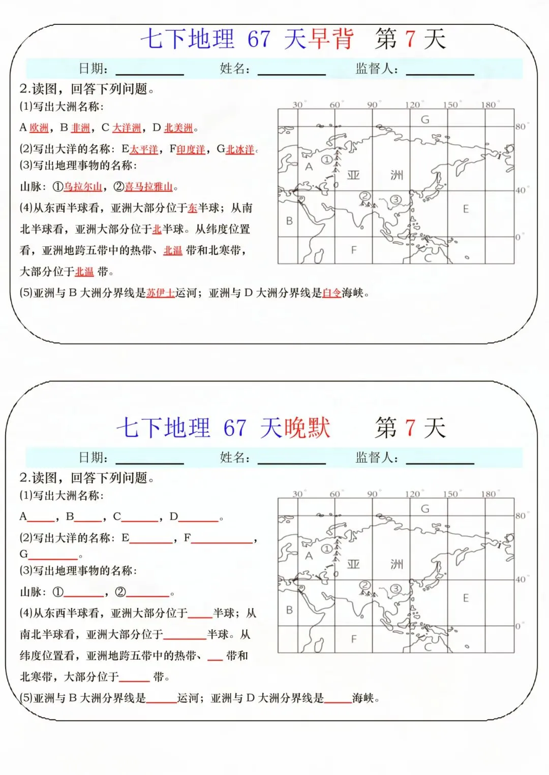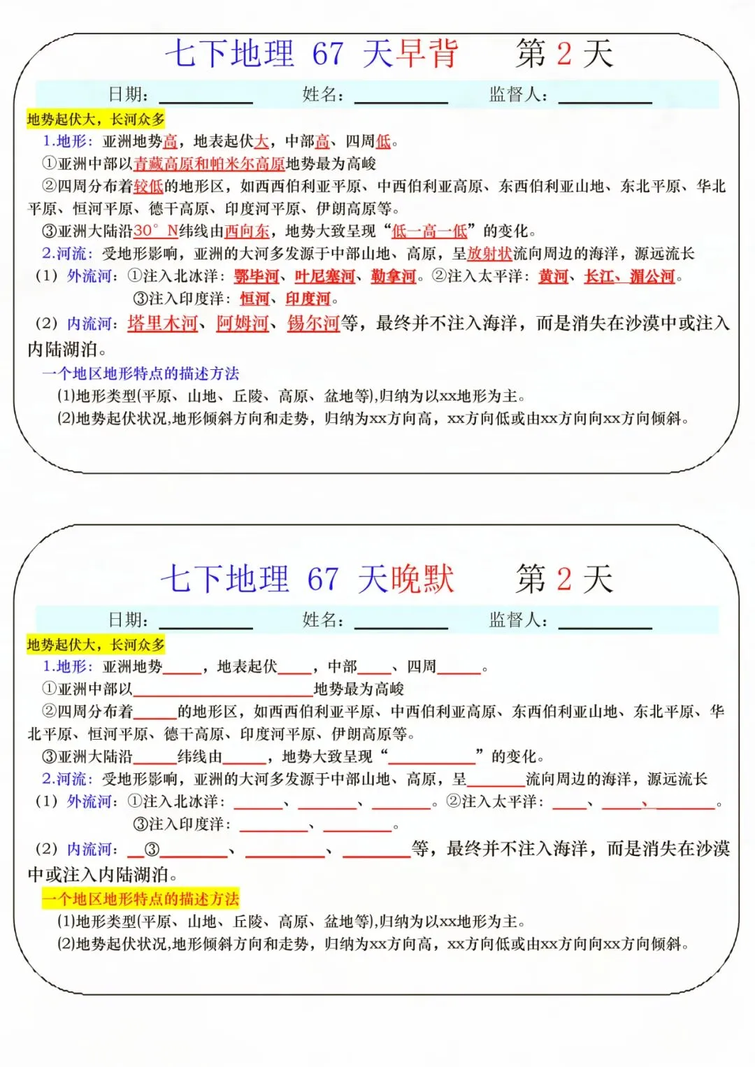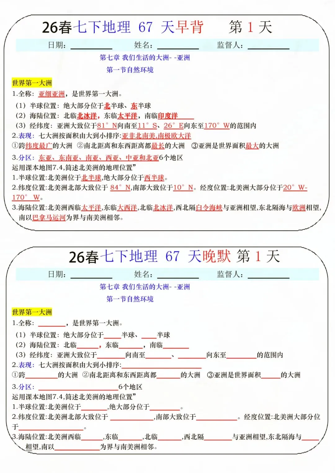 今天老师给大家整理好了:七年级下册地理早背晚默 电子版可打印!