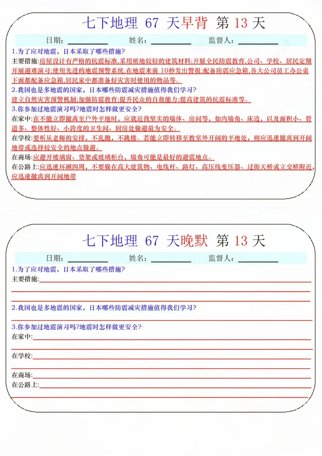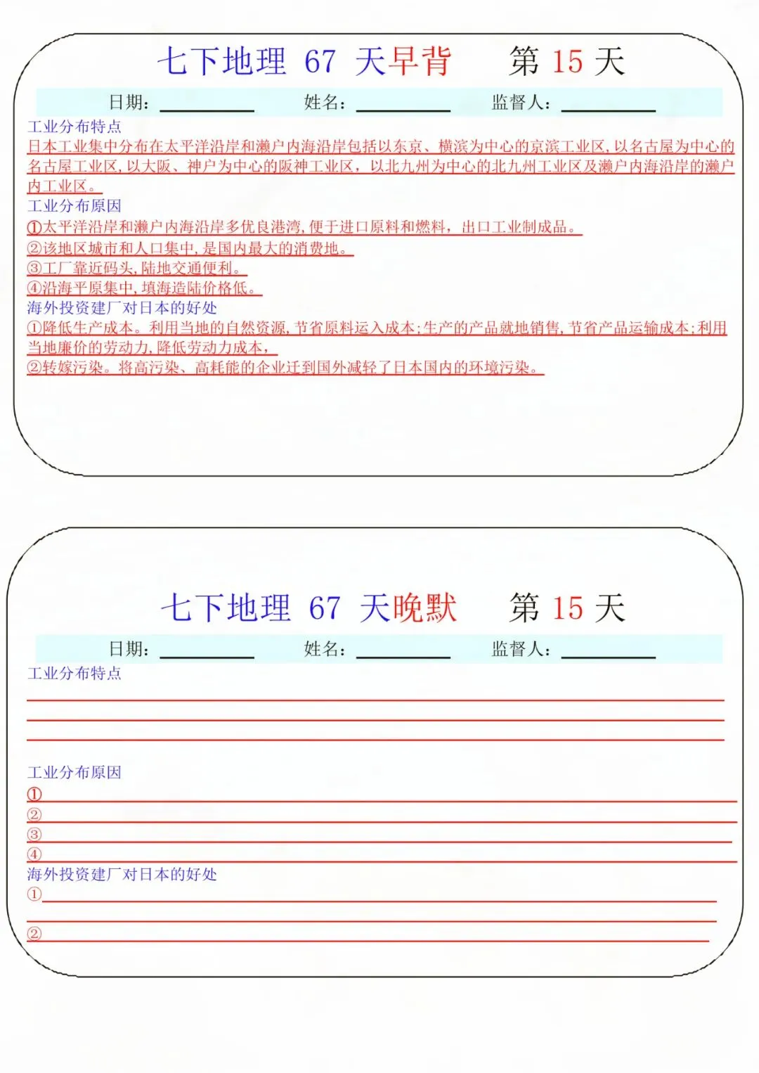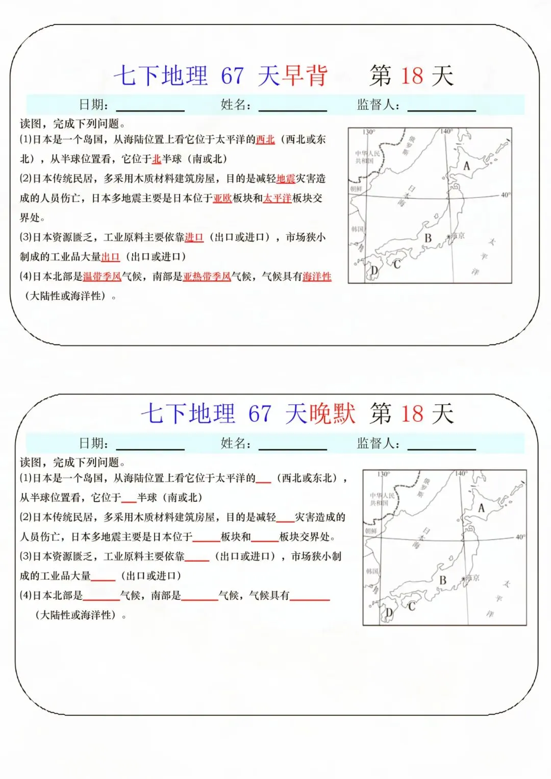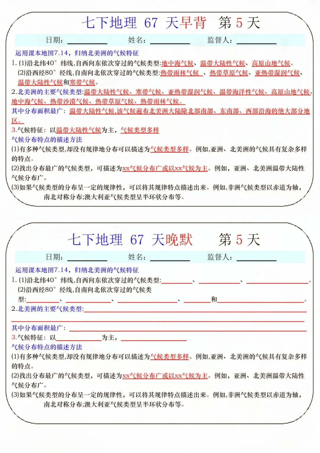 今天老师给大家整理好了:七年级下册地理早背晚默 电子版可打印!