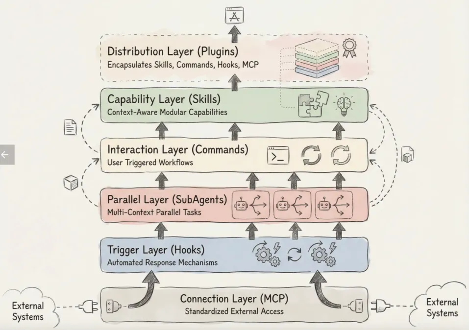Plugins(插件封装层): 封装外部工具能力(如调用 linter、运行测试、访问数据库),使 AI 能“操作世界”。