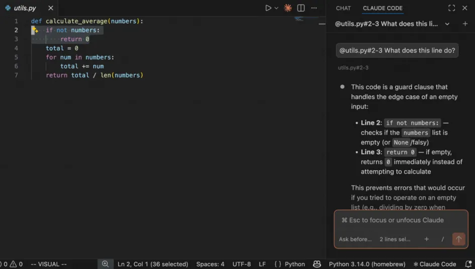 1.通过官方维护的Claude for VS Code:但只能提供比较轻量级上下文感知辅助,在 VS Code 选中代码后 → 右键 “Ask Claude”,就可以使用插件进行局部解释、生成、问答。提供的并非完整的Claude Code 能力,比如不具备完整的MCP代理协作能力。