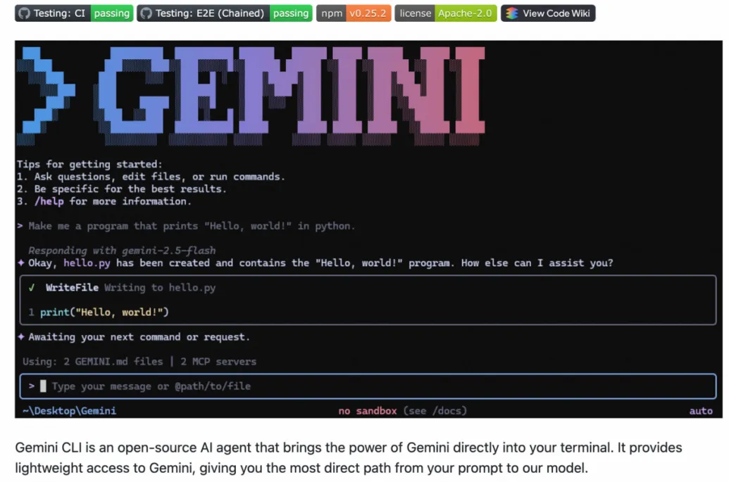 2025年6月,Google 官方发布了这款AI 终端编程助手Gemini CLI,和Claude Code一样都是用Node.js去写的,命令行工具是基于 React + Ink 实现,所以在 vscode 插件端也可以直接复用 。