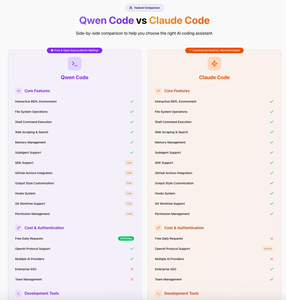我个人总结下来,Qwen Code有以下几个优势(细节你们去看官网feature对比吧):