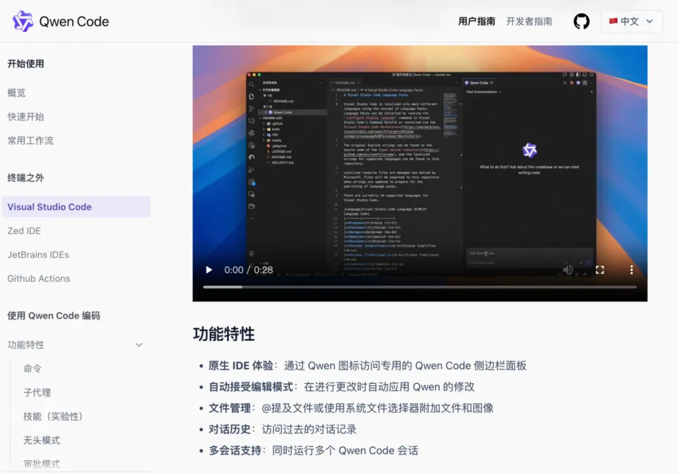 对于IDE党,也可以参考Claude CLI一样,通过三方插件的形式(如 Continue、CodeSandbox)集成Qwen Code,但是体验上确实差点意思,功能上也是CLI的子集。教程文档可参考:Qwen Code: AI Coding Agent Documentation