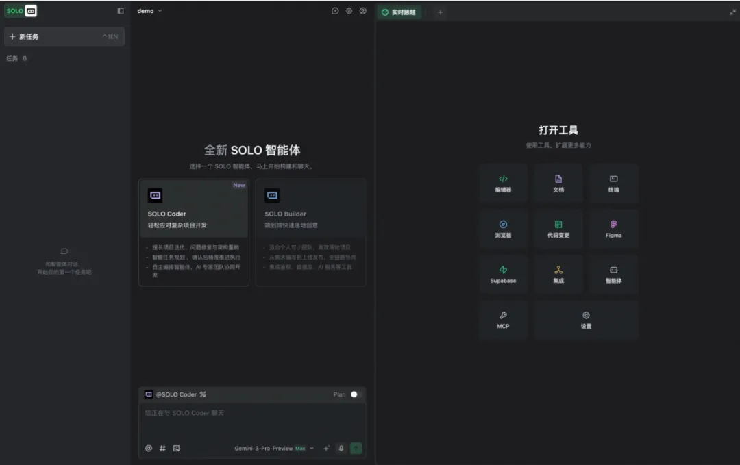 SOLO Builder:端到端应用生成器,流程为:PRD → 任务分解 → 代码 → 预览 → 发布。