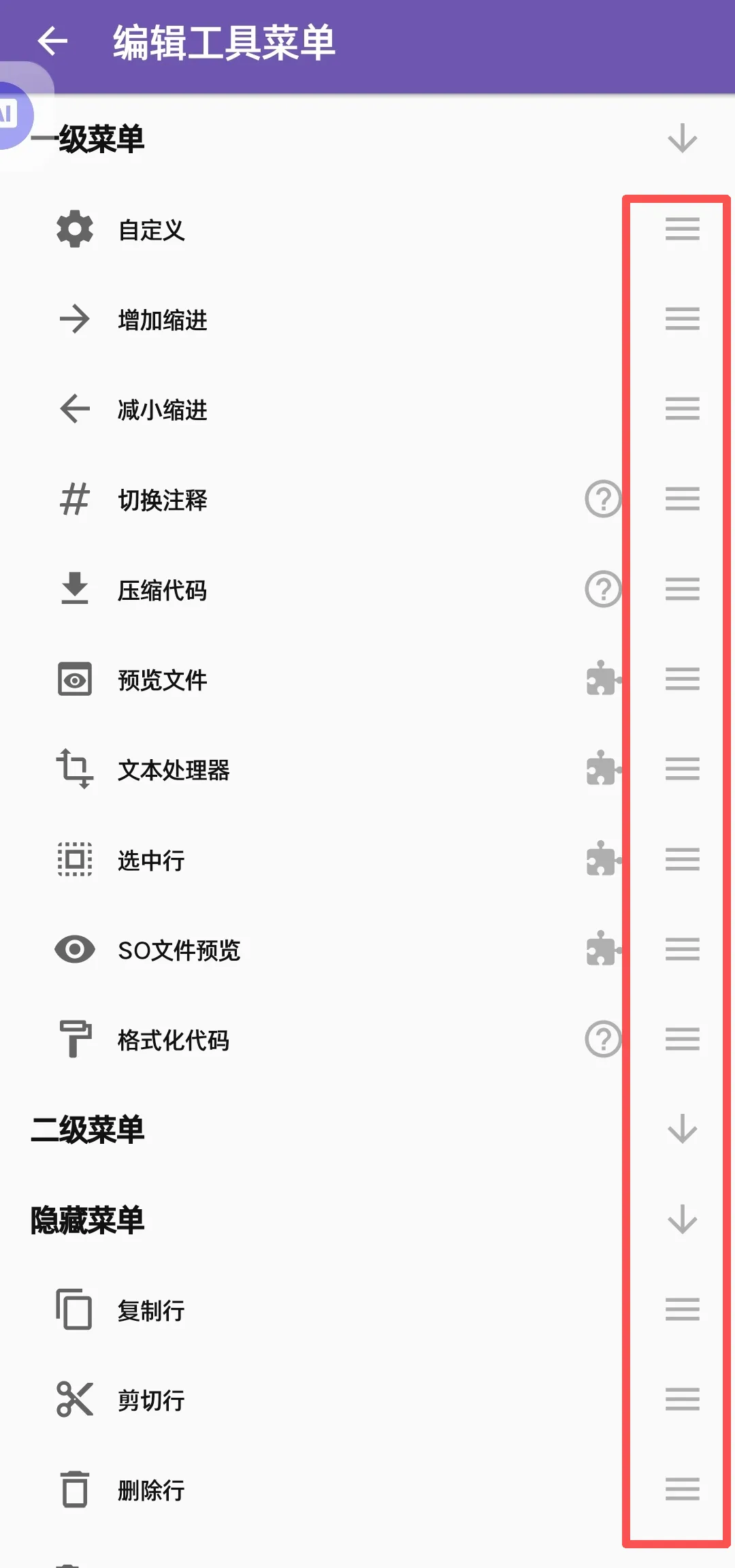 长按三个横上下拖拽,一级菜单是出现在平时的操作位,不需要的拉到底下的隐藏。