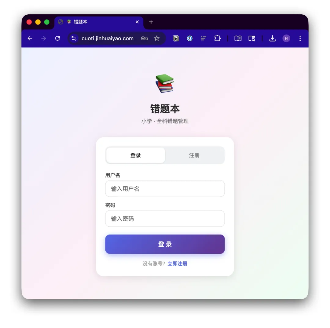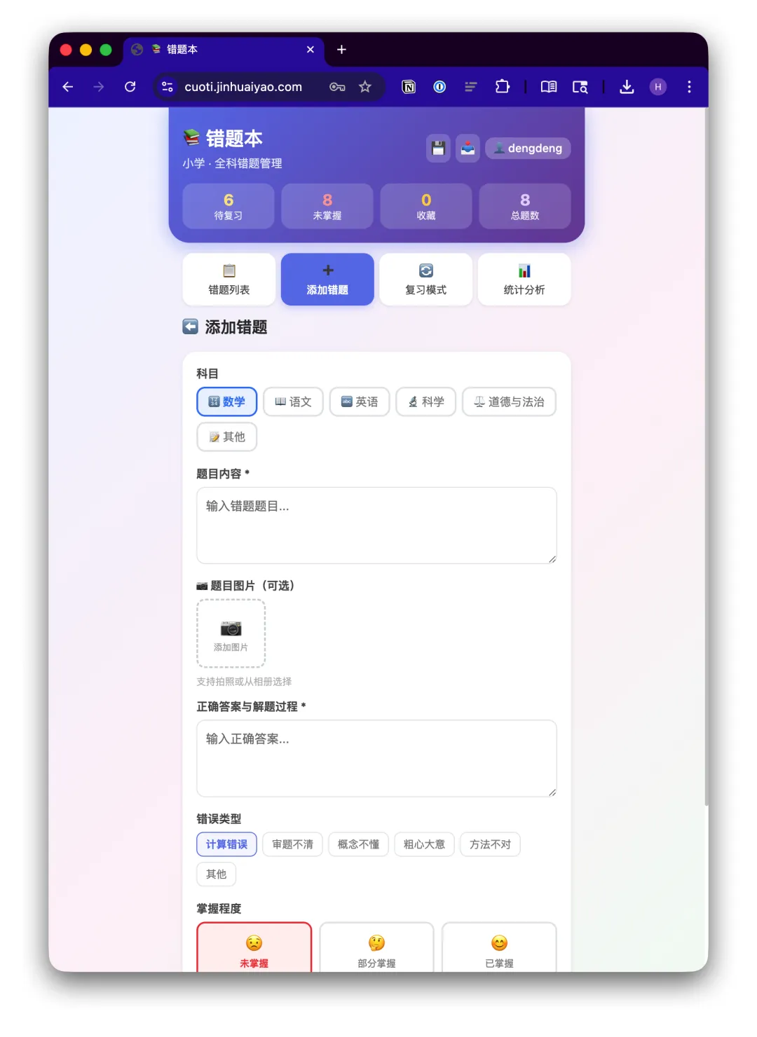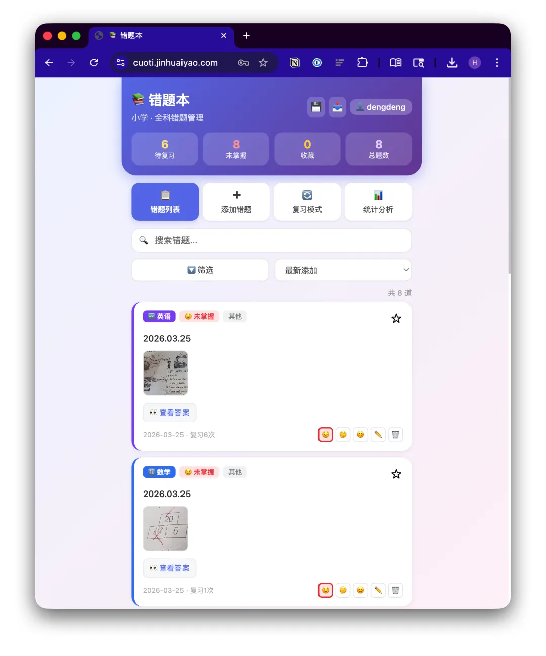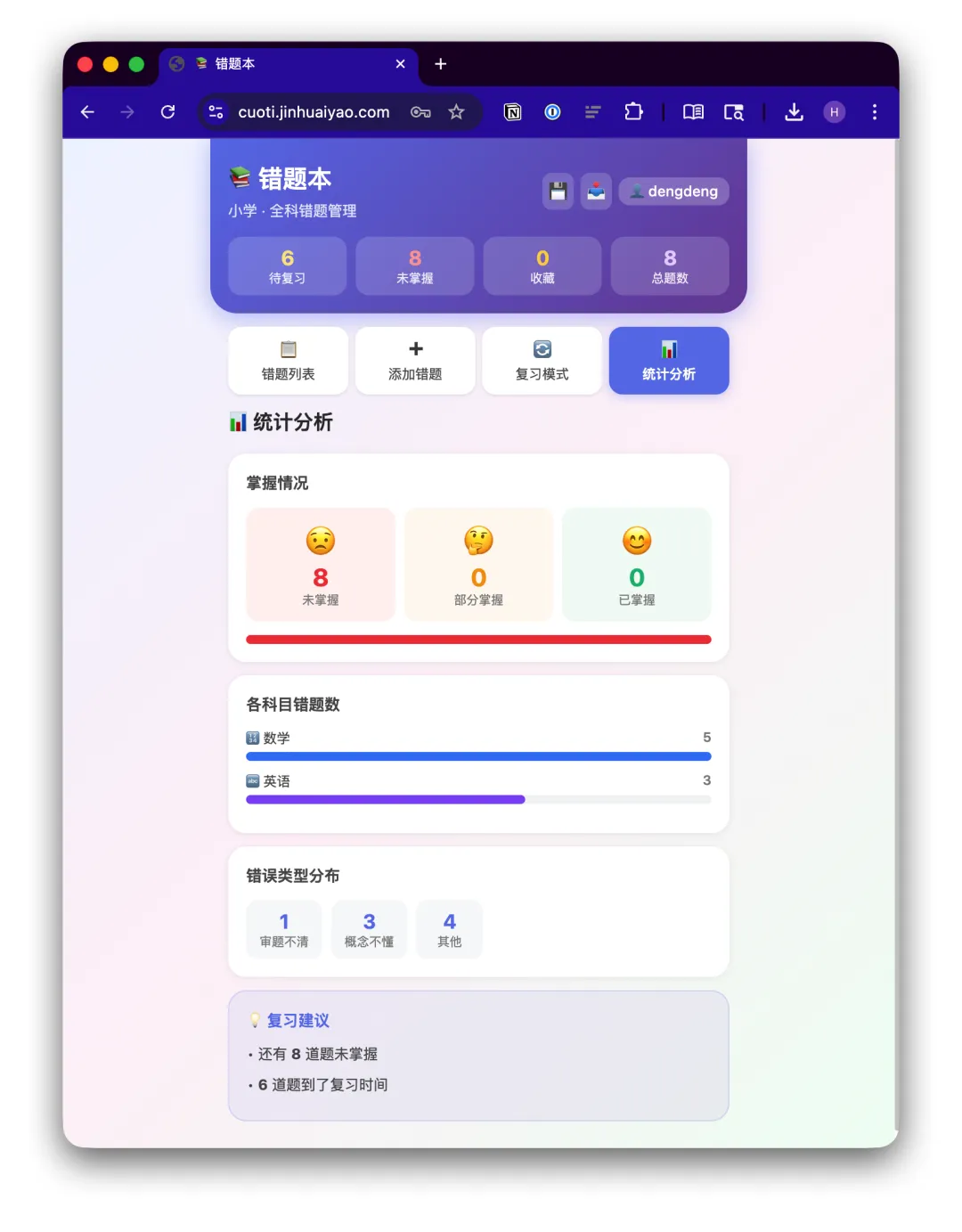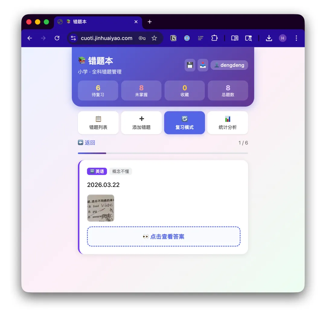 把代码部署到自己的云服务器,测试一下,让AI修复几个问题。再配置一下Nginx,一个轻量、开箱即用的错题管理系统就能工作了,支持拍照上传、间隔复习、多用户、邀请码注册。一小时就搞定了。