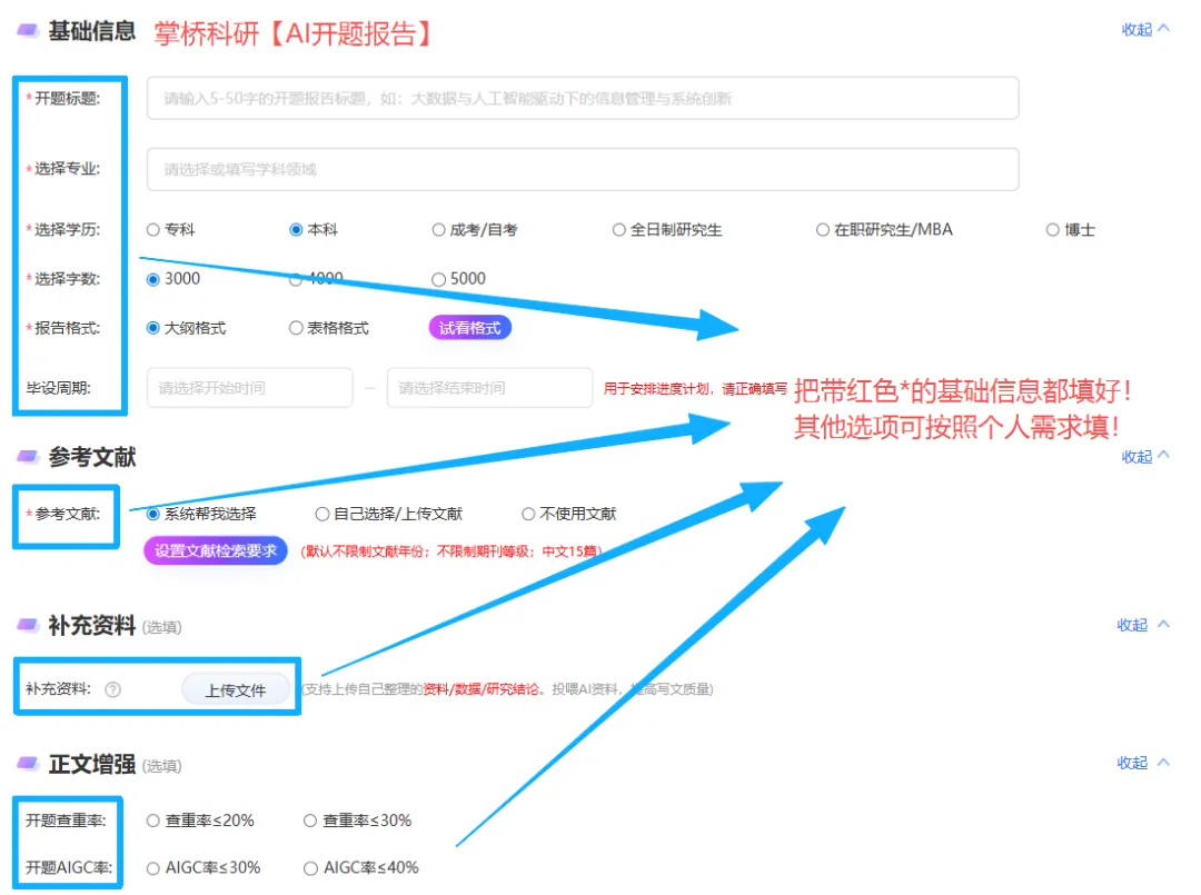 掌桥科研【AI开题报告】支持大家输入基本信息后免费生成初步的大纲。