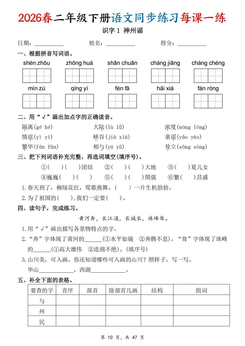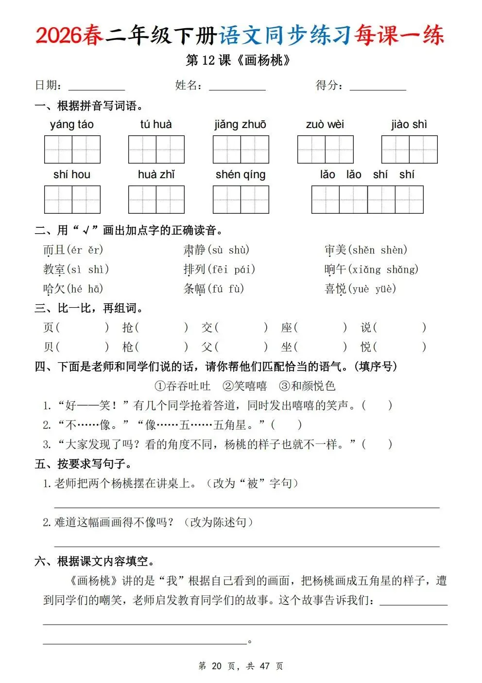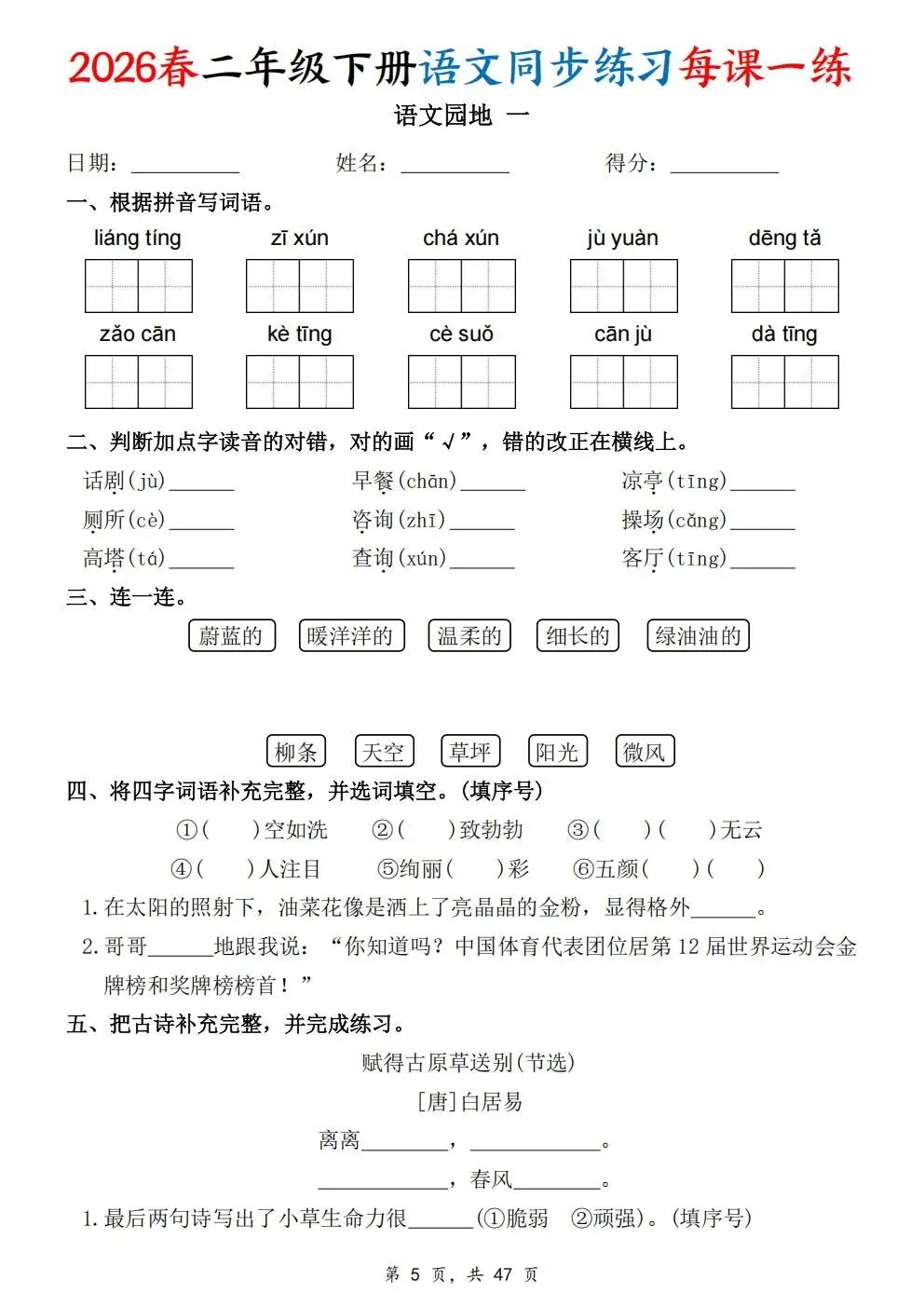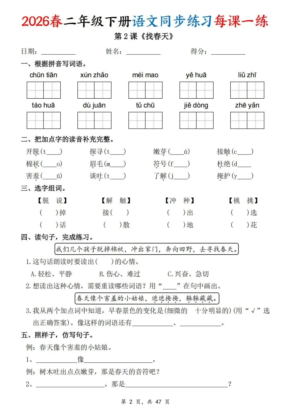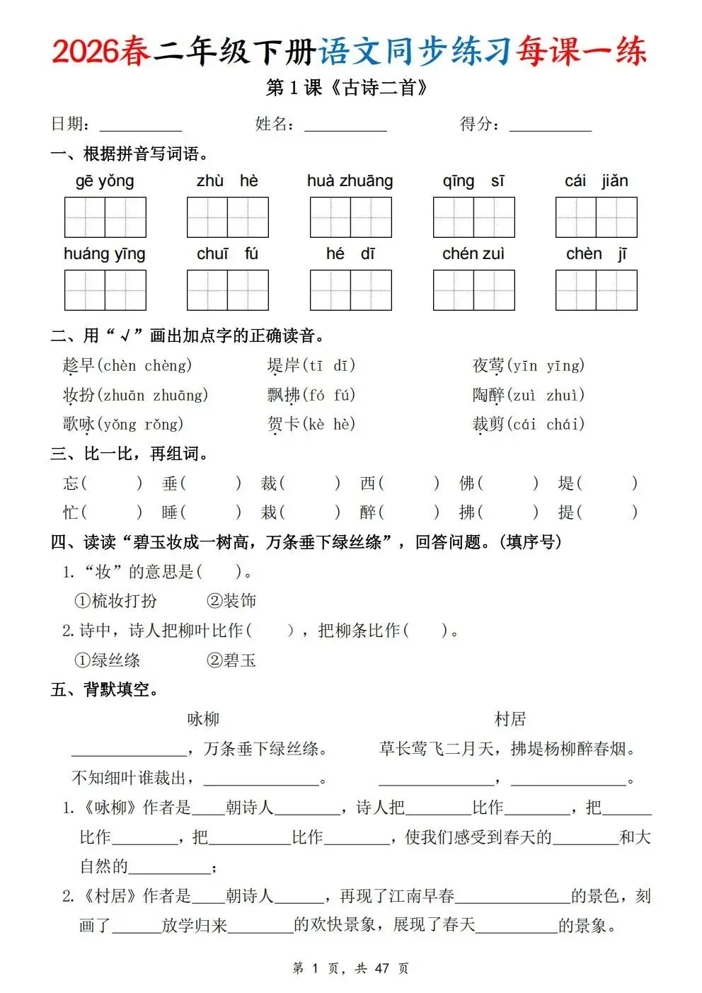 2026春人教部编版一年级下册语文《同步课本一课一练》电子版可打印!涵盖看拼音写词语、选正确读音、按课文填空等题型,一课一练巩固基础。建议老师家长收藏打印,让孩子练习使用。高清版本直接打印方便孩子复习总结!✍🏻欢迎转发到班级群,助力更多孩子学习进步!