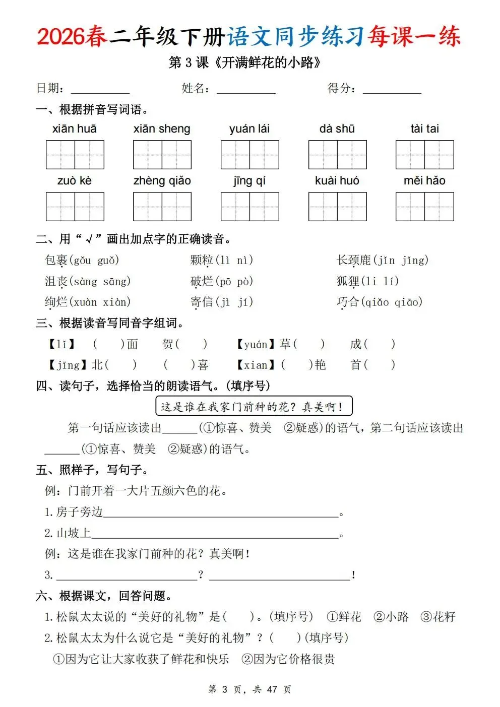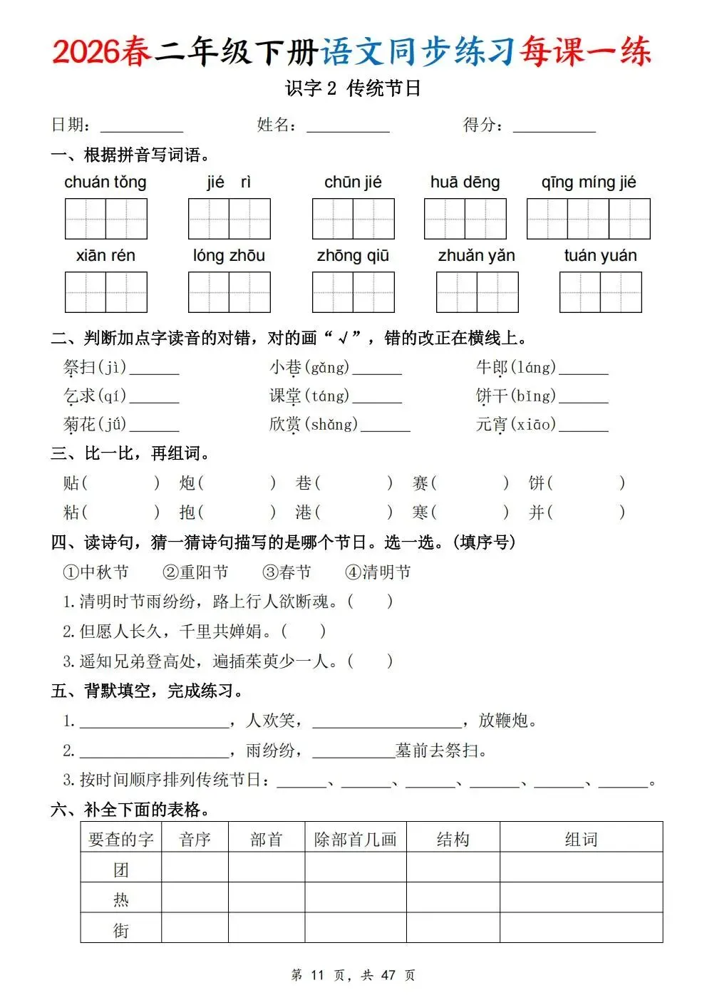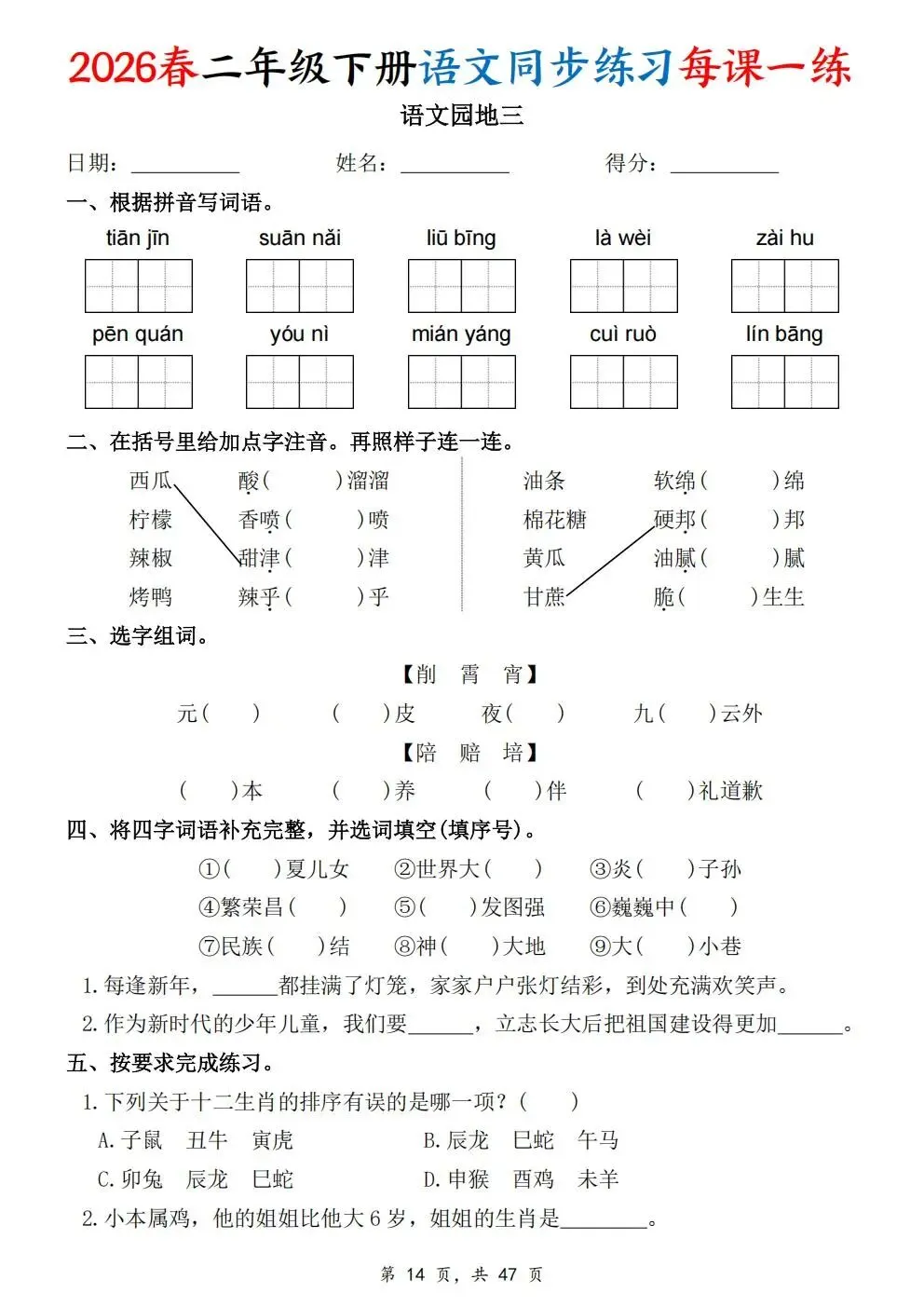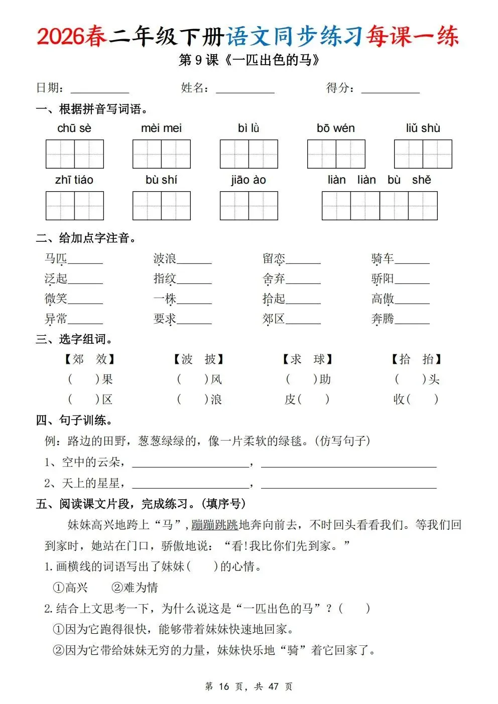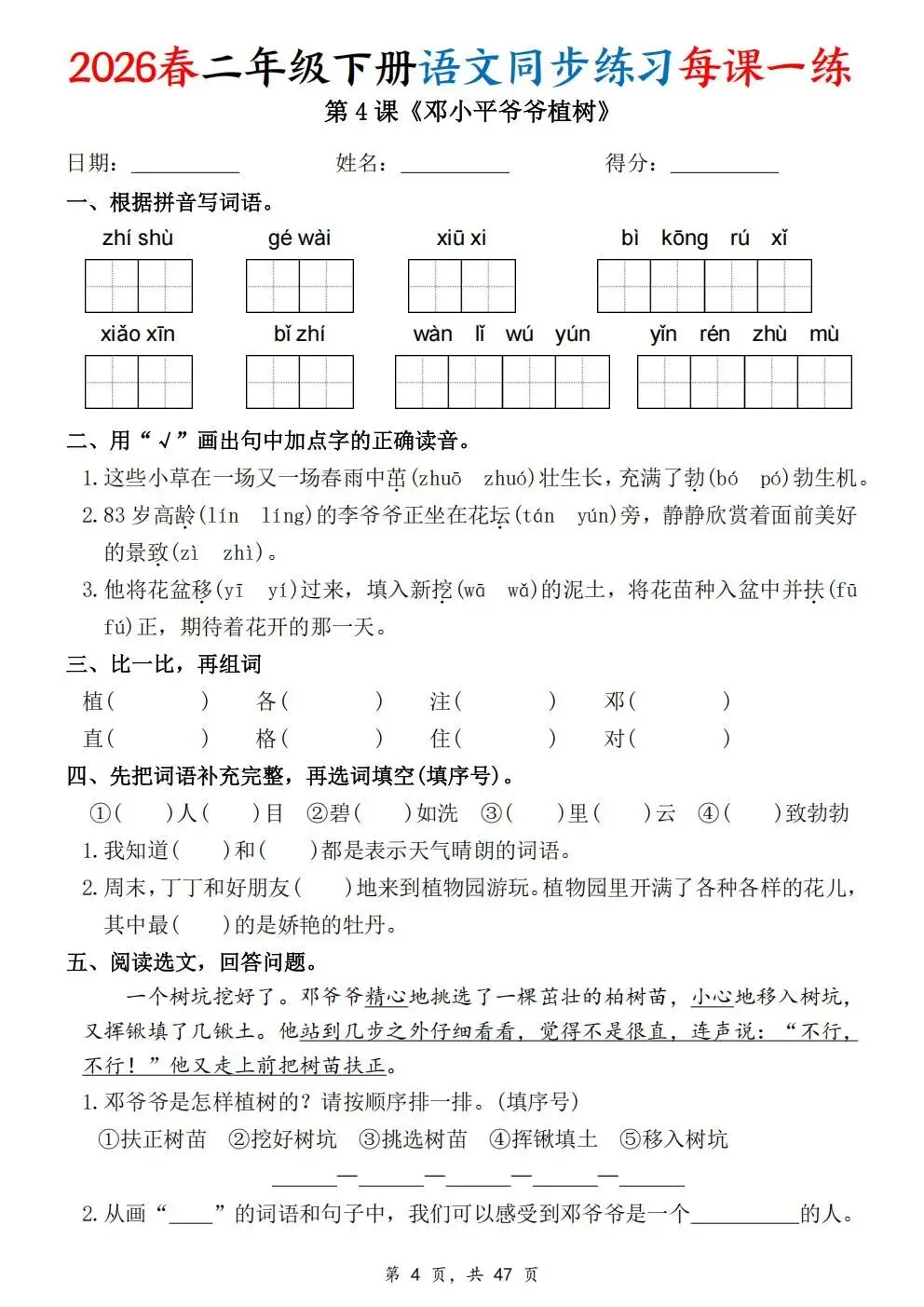2026春人教部编版一年级下册语文《同步课本一课一练》电子版可打印!涵盖看拼音写词语、选正确读音、按课文填空等题型,一课一练巩固基础。建议老师家长收藏打印,让孩子练习使用。高清版本直接打印方便孩子复习总结!✍🏻欢迎转发到班级群,助力更多孩子学习进步!