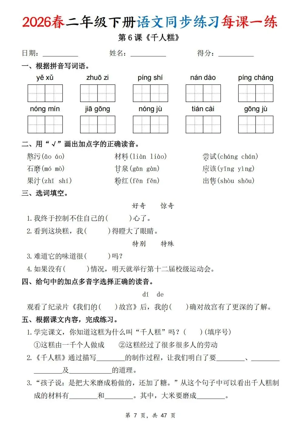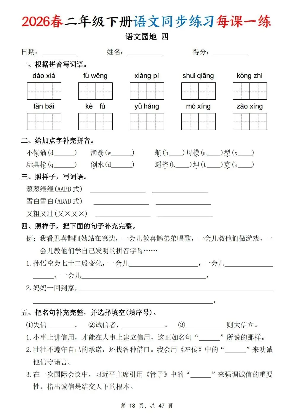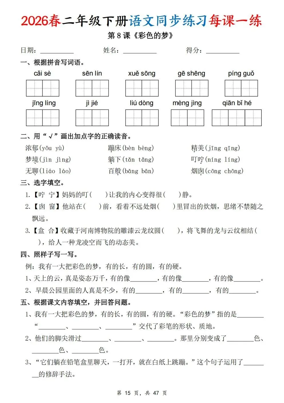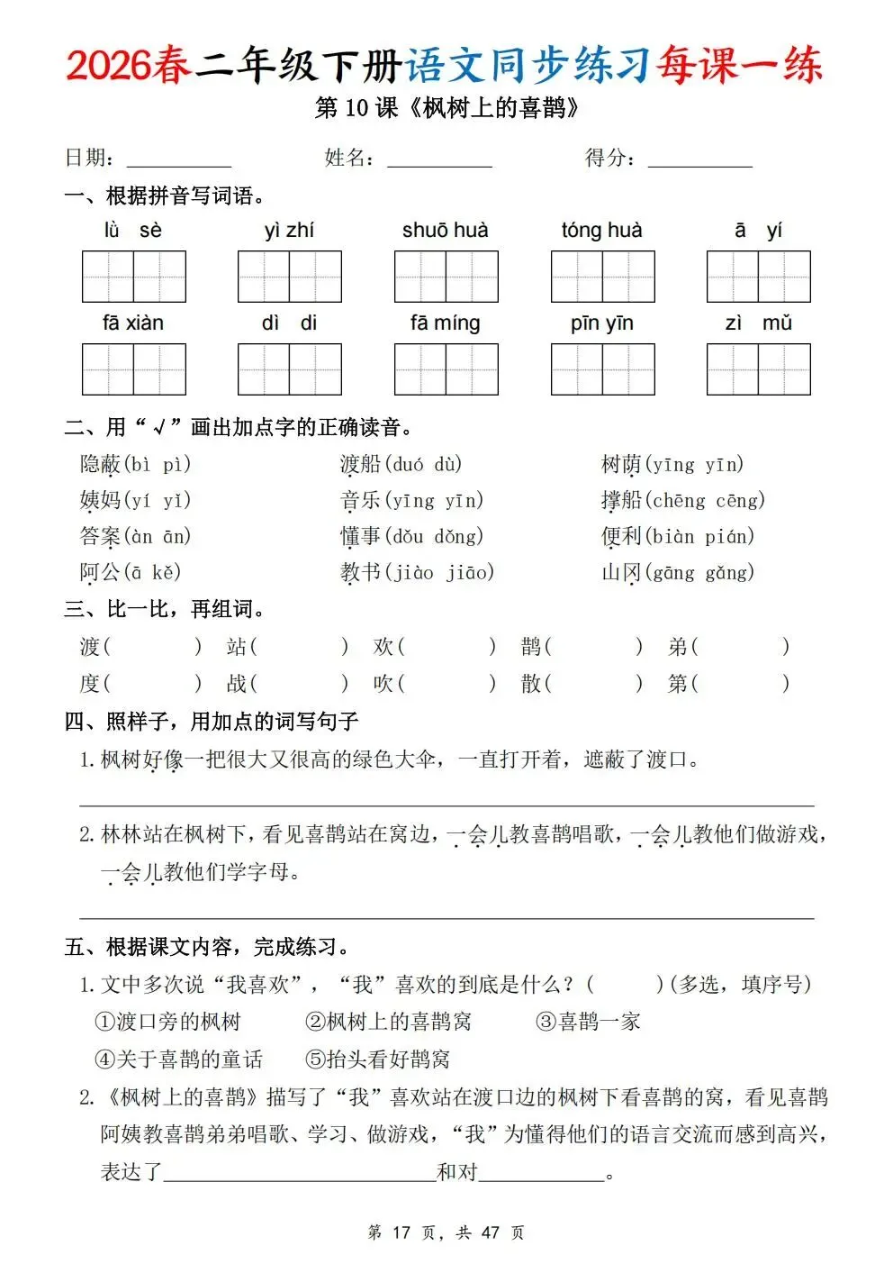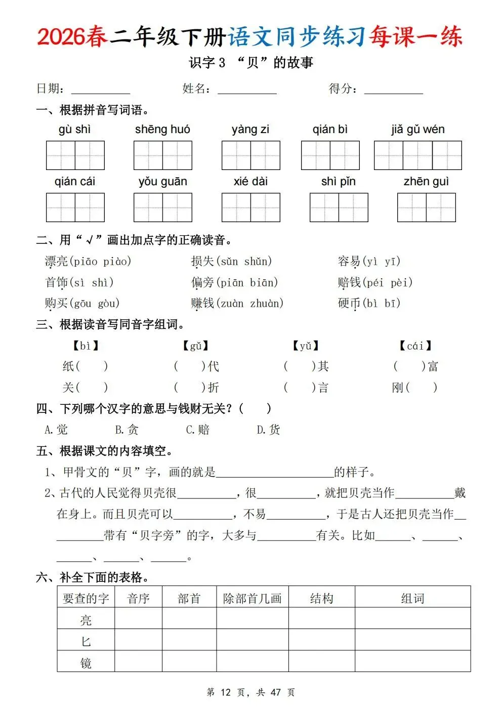2026春人教部编版一年级下册语文《同步课本一课一练》电子版可打印!涵盖看拼音写词语、选正确读音、按课文填空等题型,一课一练巩固基础。建议老师家长收藏打印,让孩子练习使用。高清版本直接打印方便孩子复习总结!✍🏻欢迎转发到班级群,助力更多孩子学习进步!