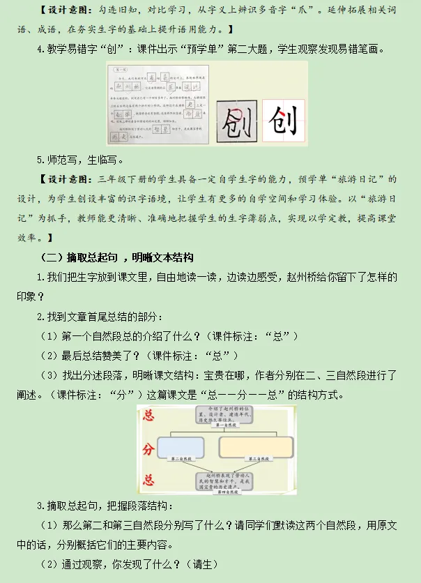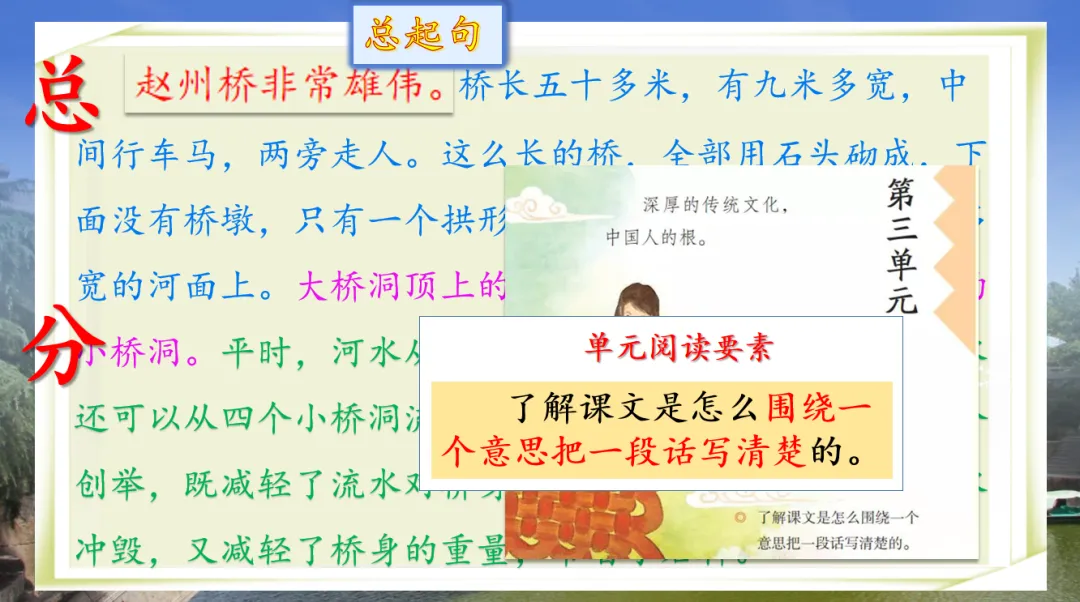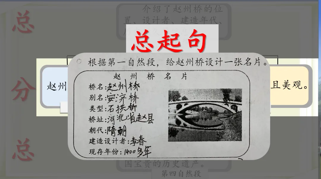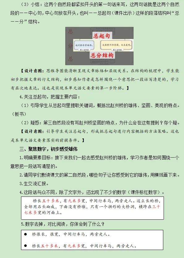 2.通过思维导图理清文章脉络,整体把握文章的篇章结构和构段方式;学习作者如何围绕总起句写出赵州桥雄伟的特点,学会围绕一个意思把一段话写清楚。