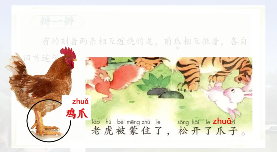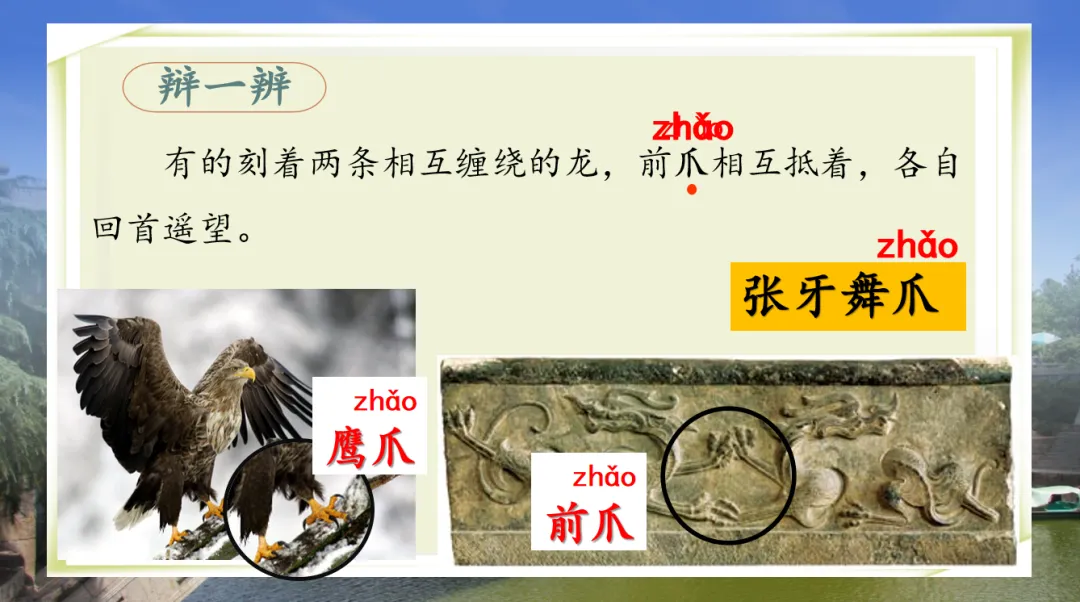 3.在《狐假虎威》里我们已经学过这个字了,在表示禽兽的脚时就读zhuǎ,比如鸡——爪。但当它表示鸟兽的脚时,读zhǎo,如:鹰爪、龙爪。还有一个成语也读爪,是——张牙舞爪。