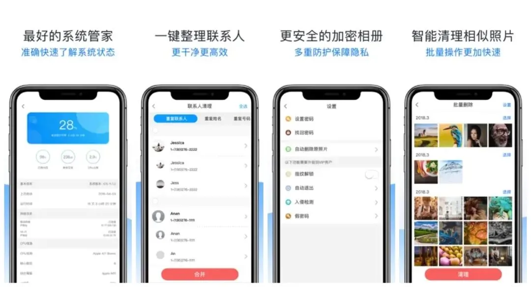 iPhone 存储空间不足?这款全能清理工具帮你彻底解决烦恼!智能扫描重复照片与大视频,高效批量清理,释放海量空间支持联系人整理合并、数据备份与恢复,更有隐私照片加密及实用扫描功能全方位守护手机安全与整洁,一站式搞定 iOS 设备管理,极简高效超省心~