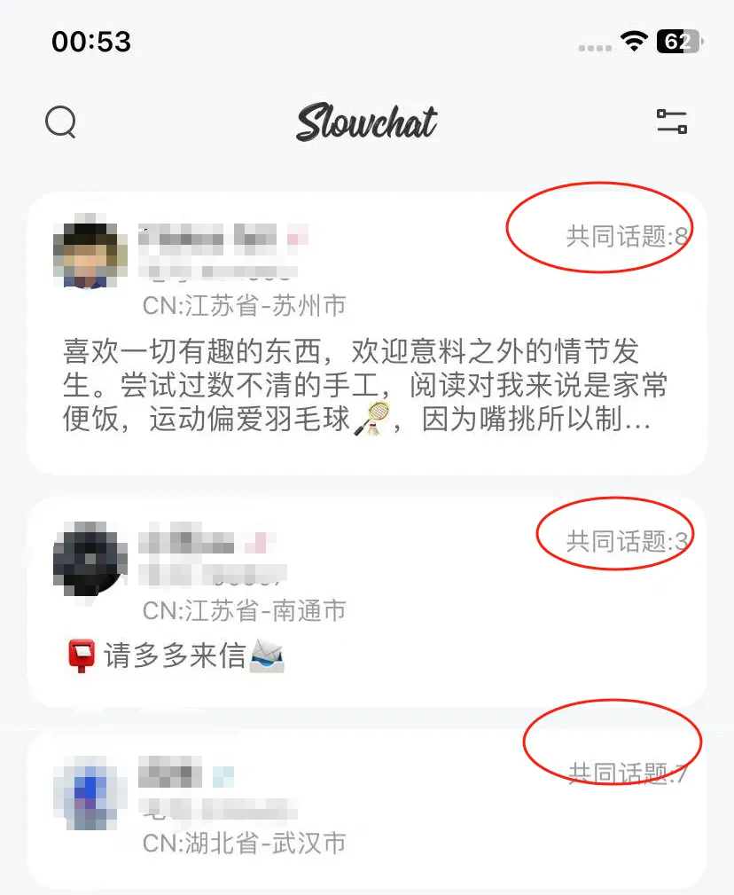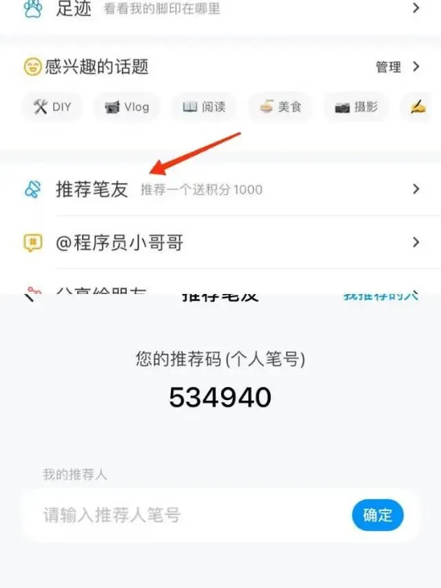 在注册时,同样也会弹出“兴趣标签”至少选5个,最多能选30个。这一步关乎到后续系统会根据所选的标签给你推荐志同道合的笔友。这一点在首页中就可以看到,有显示共同话题数量。页面布局,一刹那会觉得来到了笔友/片友版的微信。