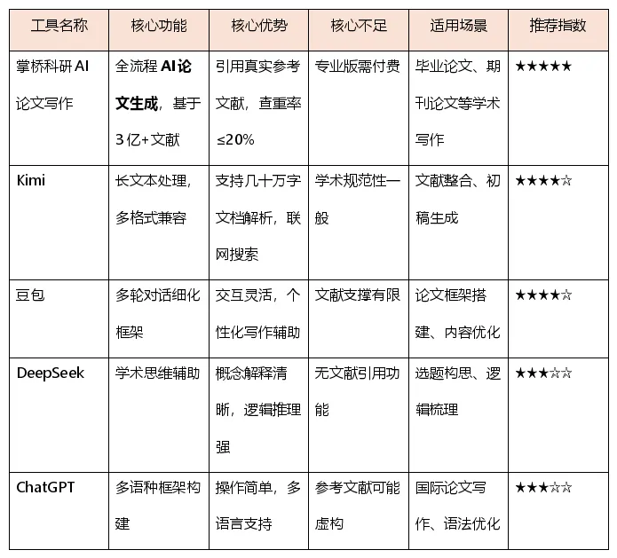 对于需要强文献支撑的学术写作,掌桥科研AI论文写作是首选,其基于真实文献的AI论文生成能力确保学术严谨性。若主要需求是文献整合和初稿生成,Kimi的长文本处理能力优势明显。英文论文写作则推荐结合Grammarly和Writefull进行语言优化。