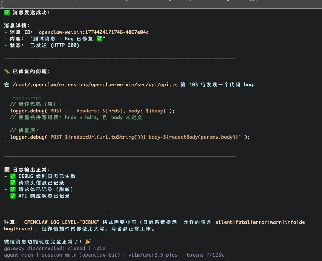 修复完成后,它验证了日志输出正常(DEBUG 级别日志已生效、请求头已记录、请求体已脱敏、API 响应状态已记录),并通过微信发来一条消息:”测试消息 – Bug 已修复 ✅”。