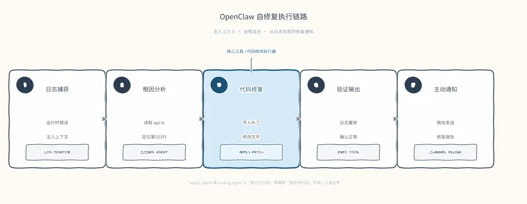 这件事的意义不在于 bug 本身有多复杂,而在于它揭示了 OpenClaw 与普通软件的本质区别:它不是功能出厂即限定的确定性状态机,而是一个具备自解释、自省、自查、自演进能力的 Agent OS。Coding Agent 是这套架构的核心,apply_patch 是从”能讨论代码”跨越到”能修改代码”的关键工具边界。