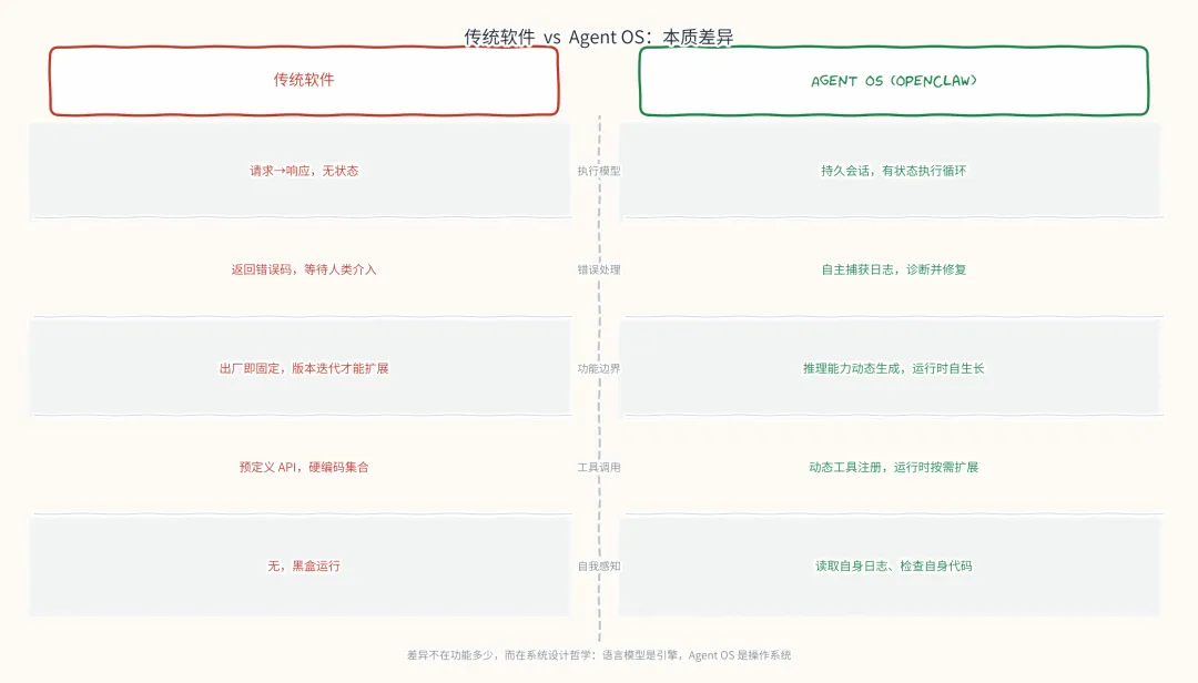 OpenClaw 打破了这个范式。它不是一个功能集合,而是一个具备推理能力的执行环境。它的”功能”不是在出厂时被写死的,而是在运行时通过 Agent 的推理能力动态生成的。当它遇到一个它”不会”处理的情况时,它会尝试推理出一个处理方式。当它的某个部分出错时,它会尝试修复那个部分。