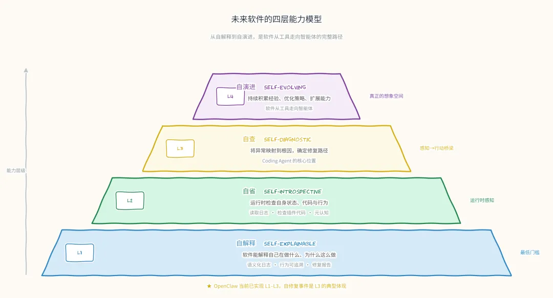 第二层:自省(Self-Introspective)是运行时感知的基础。 软件需要能够在运行时检查自身的状态、代码和行为。这要求软件具备某种形式的感知能力——不只是执行任务,还能观察自己执行任务的过程。OpenClaw 能够读取自身的日志、检查自身的插件代码,这是自省能力的直接体现,也是在上一步的基础上的一步很大的飞跃。