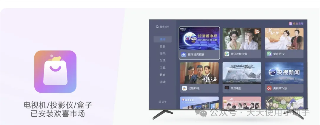 备注:此教程不适用于全部型号的电视;如无法安装,可咨询电视厂家或者购买电视的京东/淘宝客服,获取应用安装教程