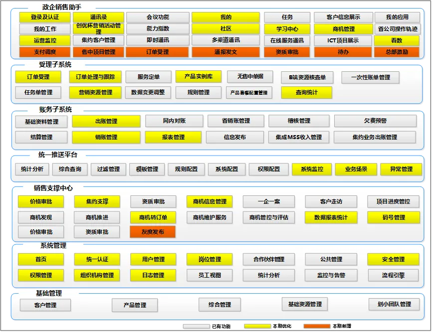 功能需求:优化订单受理、订单处理与跟踪、产品实例库、查询统计、营销资源管理五大模块。