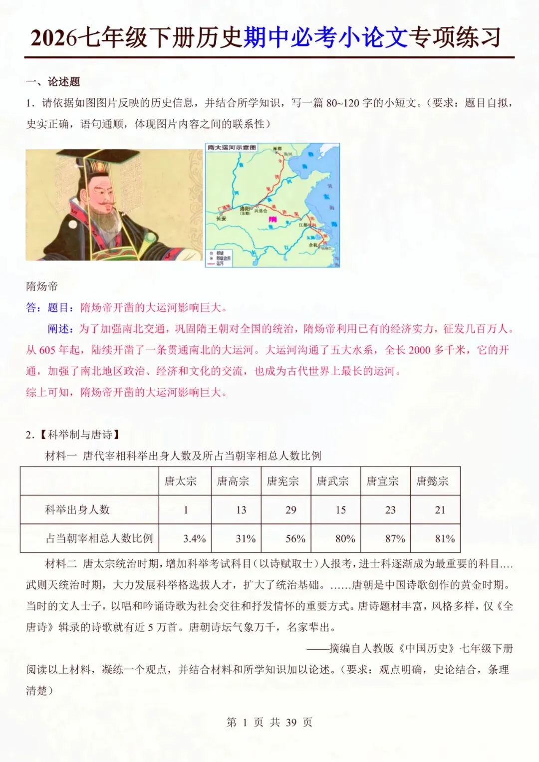 今天老师为大家全部整理好了:七年级下册历史|期中必考小论文专项练习 电子版可打印!