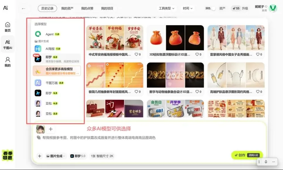 2.集成多模型AI工具,生图、修图一站式搞定。