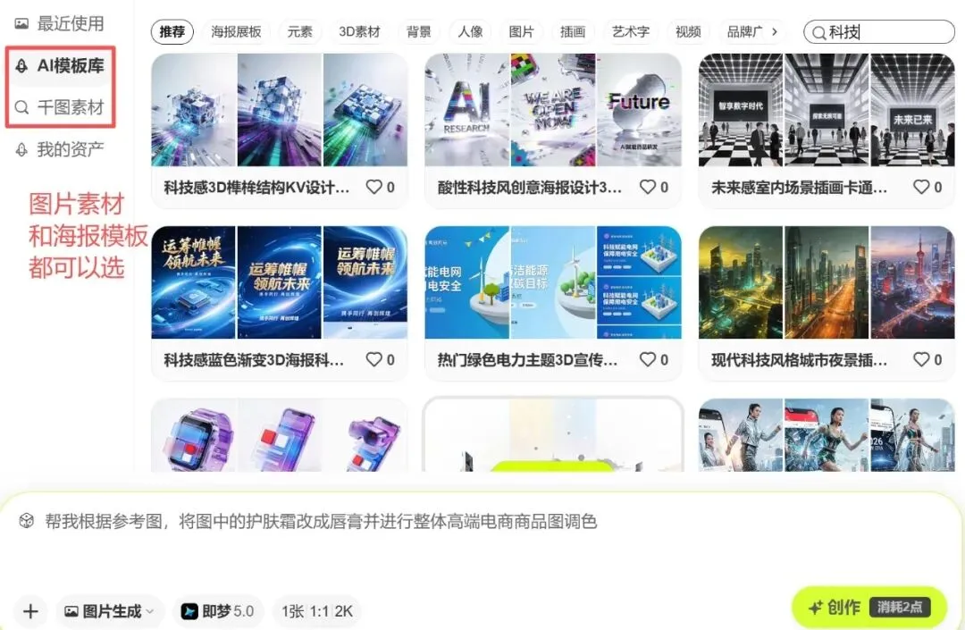 在参考图选择区域,从千图网自带图库中挑选一张风格、主题契合科技感促销海报的图片作为参考;