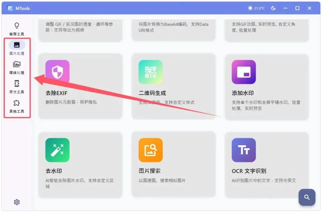 在工具中包括了图片处理、媒体处理、开发工具以及其他工具几个项目。