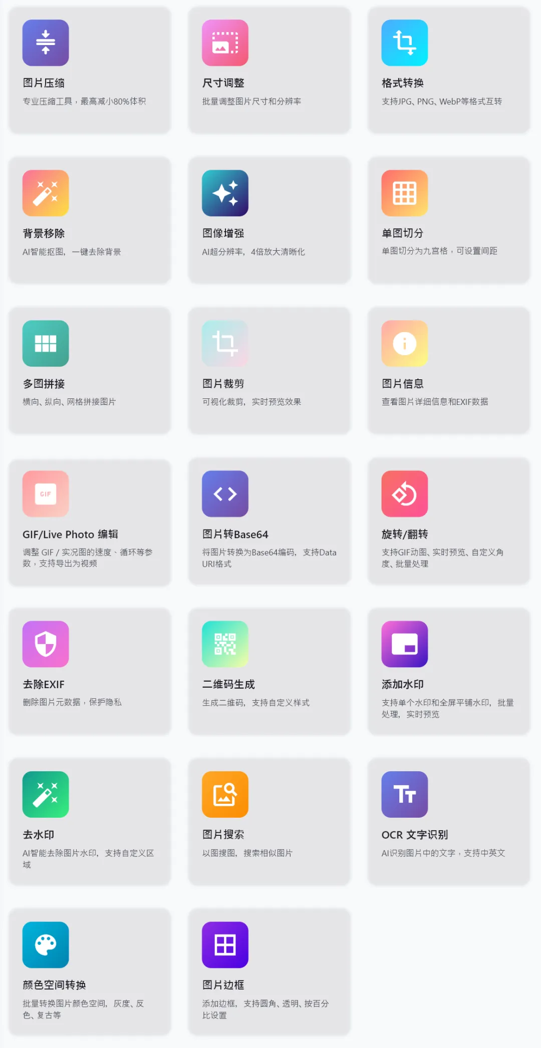 进入到图片处理选项中可以看到,包括了图片压缩、图片尺寸调整、图片格式转换、图片背景移除、模糊图片变清晰、添加或去除图片水印等多达20项AI功能,几乎涵盖了你对图片的所有处理需求。
