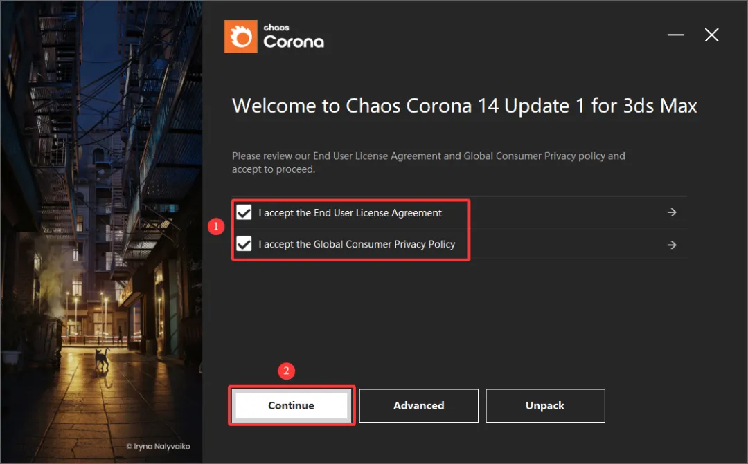 1、双击运行程序:1.chaos-corona-14-update-1-3dsmax.exe