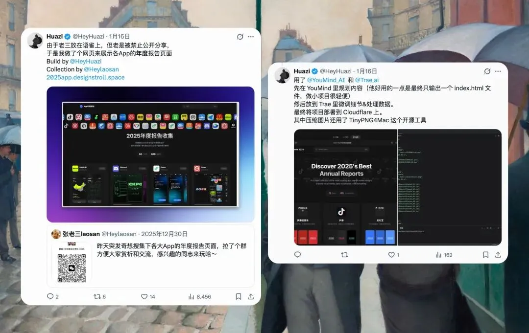 主要做了这几件事:调整一些样式细节让视觉效果更舒服、处理各个 APP 年度报告的数据(标题、描述、截图等)、优化交互体验。有些地方 YouMind 生成的代码不够优雅,在 Trae 里可以快速迭代修正。