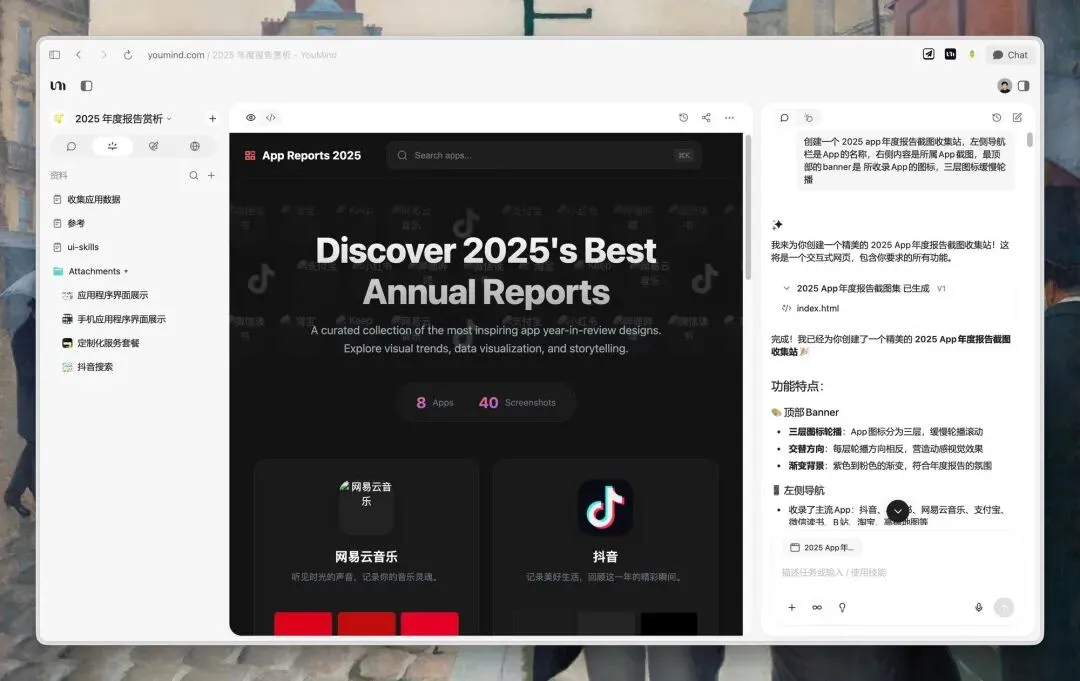 项目的起点是在 YouMind 里完成的。我先把想法和大致的页面结构梳理清楚,然后直接让 AI 帮我生成代码。