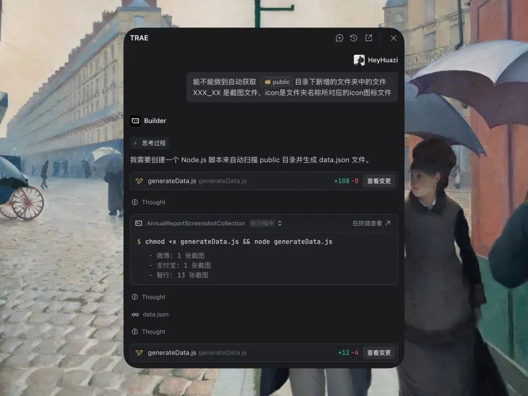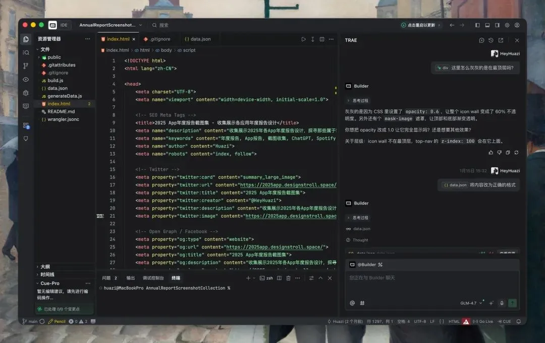 从 YouMind 导出代码后,我把项目放到了 Trae 里继续开发。Trae 作为一个 AI 原生的 IDE,在处理细节调整和数据处理这块效率很高。