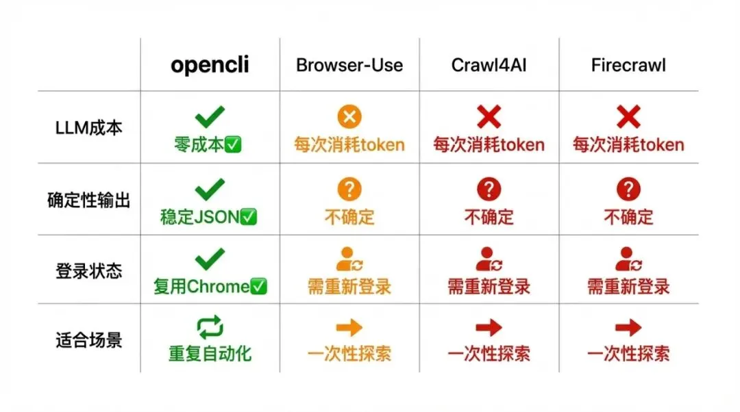 零 LLM 成本。 每次运行不消耗任何 token。用 Browser-Use 或 Stagehand 做同样的事,每次都要花 AI 推理费用。OpenCLI 的命令是预定义的确定性逻辑,跑一万次不花一分钱。