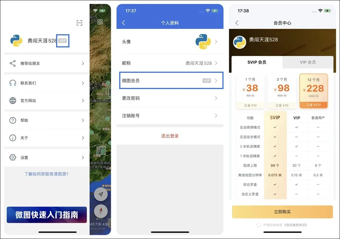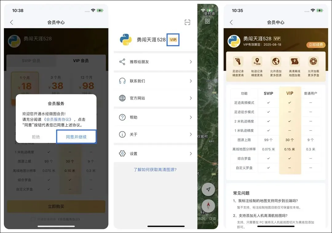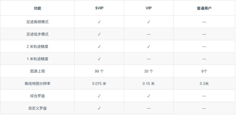 目前,水经微图账户分为普通用户、VIP用户、SVIP用户,这三类用户的区别在于功能使用权限方面,比如轨迹记录中的精度模式,自定义图源数量、自定义罗盘等功能。
