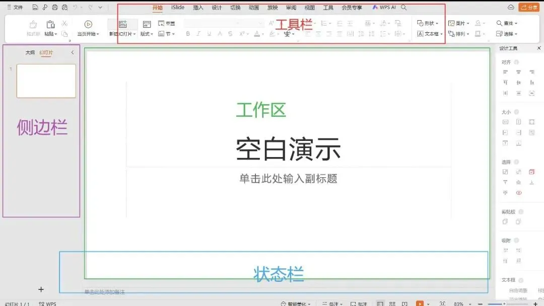 2. 界面速览:顶部功能区(开始/插入/设计/动画/放映)、左侧幻灯片缩略图、中间编辑区、底部状态栏(页面/比例)。